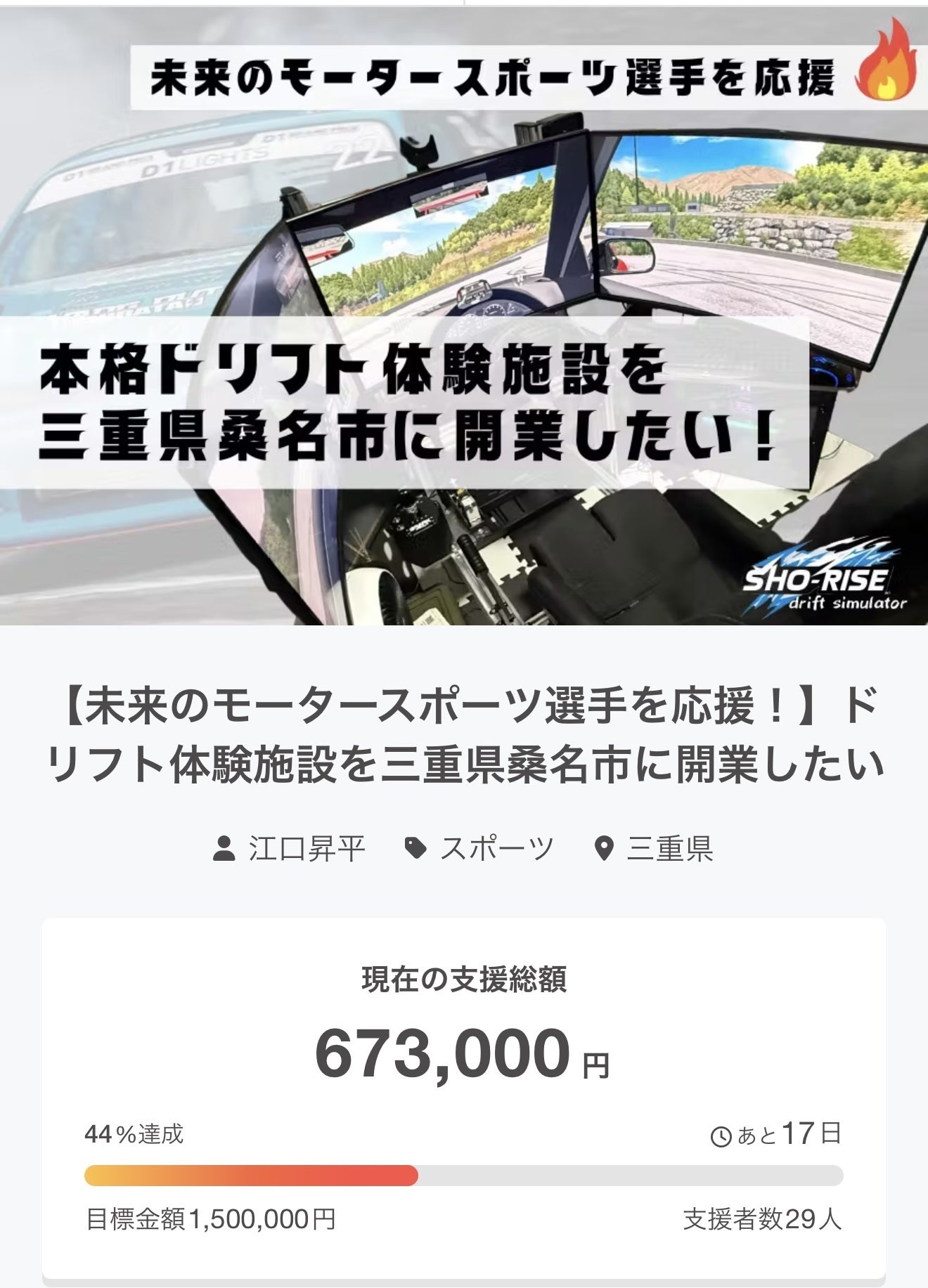 本プロジェクトのクラウドファンディングは、募集期間を終了いたしました。結果として、44名の方より843,000円のご支援をいただきました。多くの方にご支援・ご協力をいただき、誠にありがとうございました。現在、店舗の準備は整っており、ドリフトシミュレーターの導入も完了しております。2026年1月中旬頃のオープン予定に向けて、最終準備を進めております。皆さまからお預かりしたご支援は、設備費・運営準備費・リターン制作費として、大切に活用させていただきます。また、リターンにつきましては、準備が整い次第、順次発送・ご案内してまいります。今後は、店舗の状況やオープンに向けた進捗、イベントなどの情報をこちらの活動報告を通じて随時お知らせしてまいります。引き続き、どうぞよろしくお願いいたします。SHO-RISE drift simulator江口 昇平