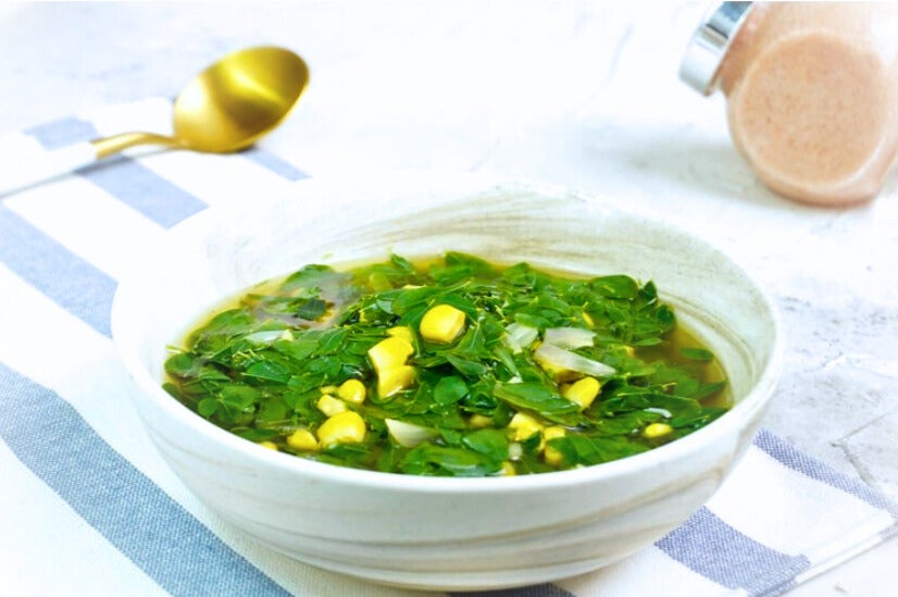 トウモロコシとモリンガのスープ。出汁が美味しいので味付けは塩だけ