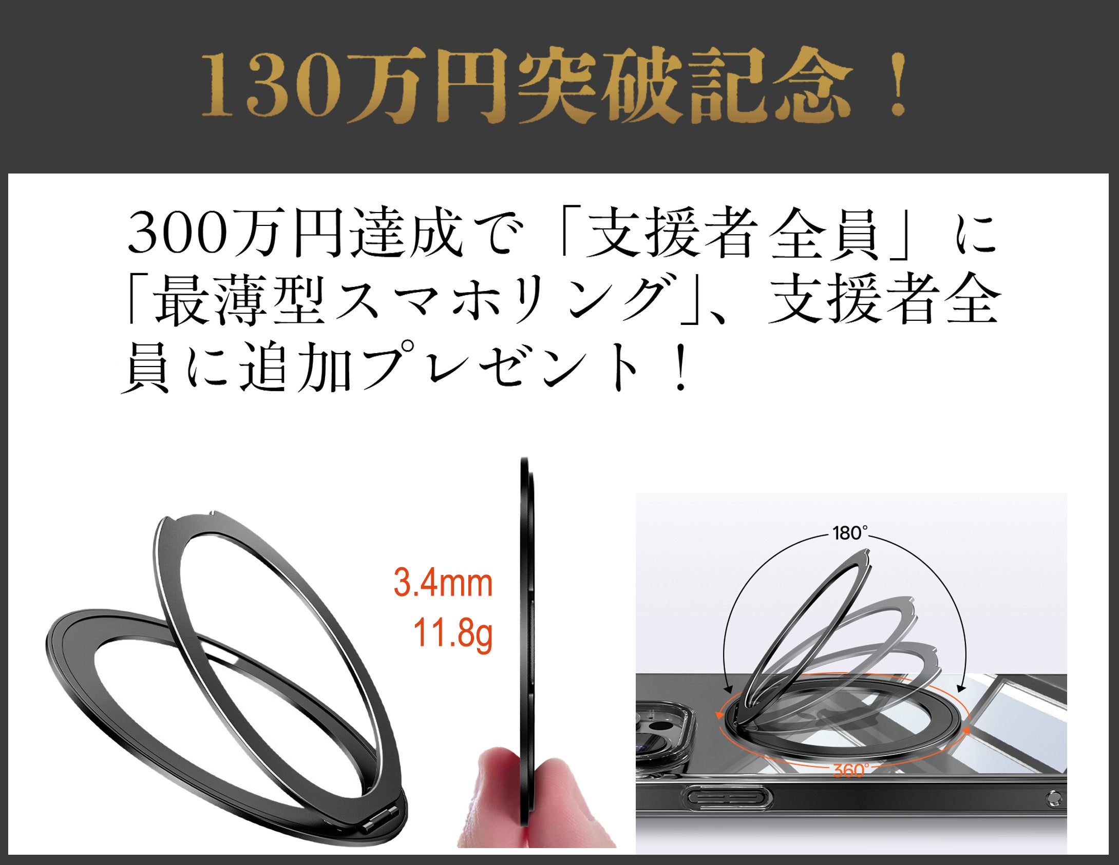 もし【支援総額300万円】を達成できた際には、これまでにご支援くださった皆さま「全員」に、「最薄型スマホリング」をプレゼントさせていただきます(お選びいただいたリターンに同梱予定です)。