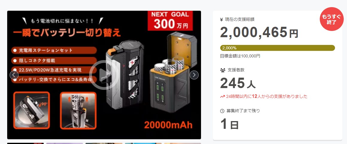 2025/09/29 10:36皆様のご支援に心より感謝申し上げます。「瞬速交換+4本同時充電でもう電池切れに悩まない!ステーション一体型・双方向充電器」プロジェクトへのたくさんのご支援、誠にありがとうございます。皆様の温かいご応援のおかげで、支援総額が200万円を超えました。この素晴らしい成果に、弊社スタッフとメーカー一同、心から感謝しております。プロジェクトは引き続き進行中です。今後も皆様に喜んでいただけるよう、最後まで全力で取り組んで参ります。これからも変わらぬご支援を心よりお願い申し上げます。 もっと見る