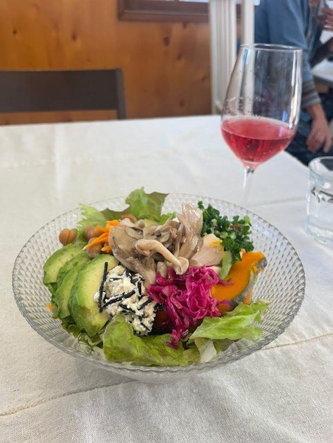 プレオープンのランチチケットでは、通常メニュー予定のものが食べられる分だけご注文いただけるスタイルだったので、「15品目以上が入った腸活サラダボウル」「チキンジェノベーゼサンドイッチ」「ヴィーガンベジサンド」「朝地牛の酒粕入りビーフシチュー」、他にスープ2種や天然酵母のパンなど、いろいろ召し上がっていただきました。食後のおすすめは酒粕チャイor酒粕ココア。これまでは麹がメインでしたが、地元の酒蔵の酒粕や自家製酵母なども取り入れ、より一層“発酵”に焦点をあてた料理を提供していきたいと考えています。
