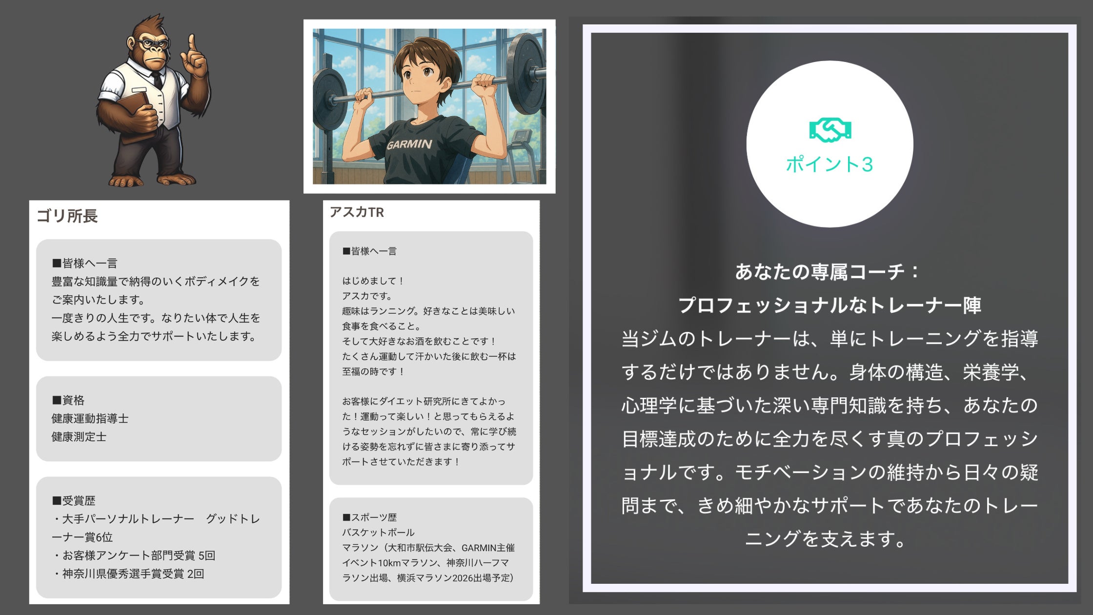 ただのパーソナルトレーニングではなく、遺伝子検査、サプリメント、プロスポーツ選手の有酸素運動の指導など様々な観点からお客様に確実にアプローチいたします!