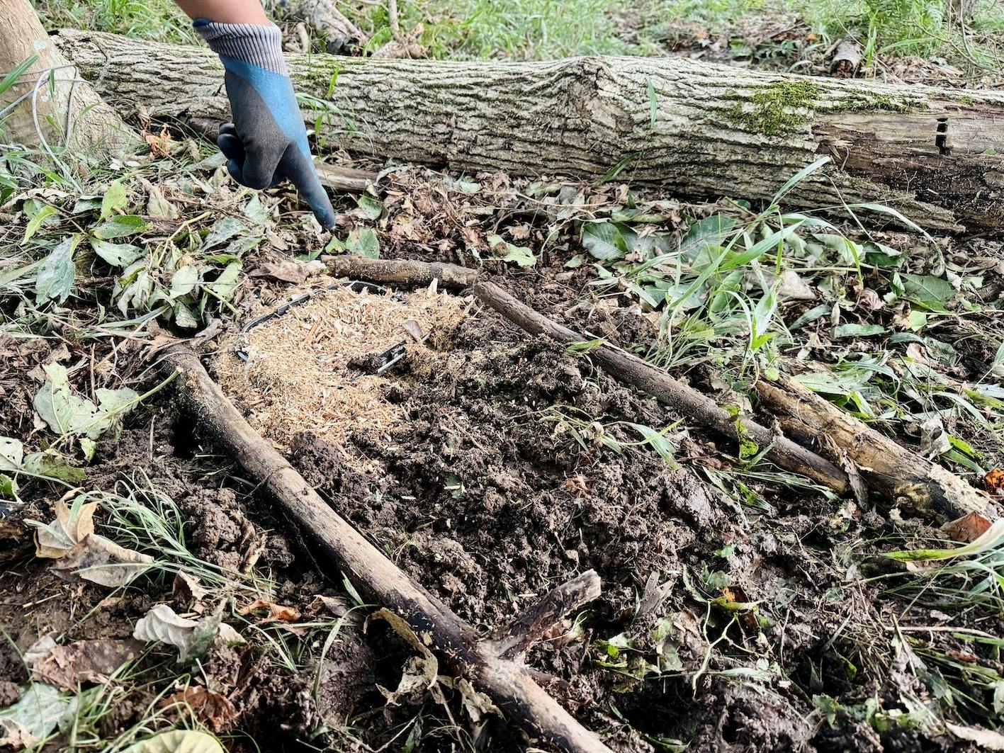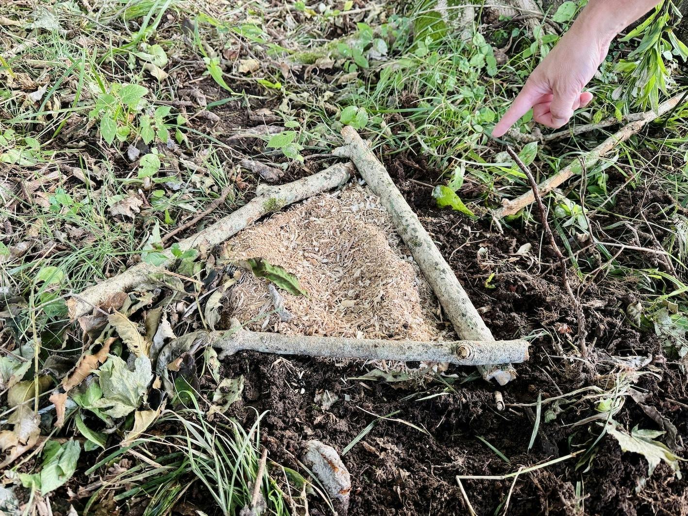 1ヶ所目は、罠を囲った枝の枠の外に足跡がありました。