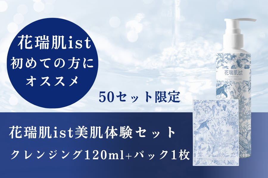 クレンジング120mlの小ボトル1本とパック1枚の【花瑞肌istはじめてセット】が登場しました!