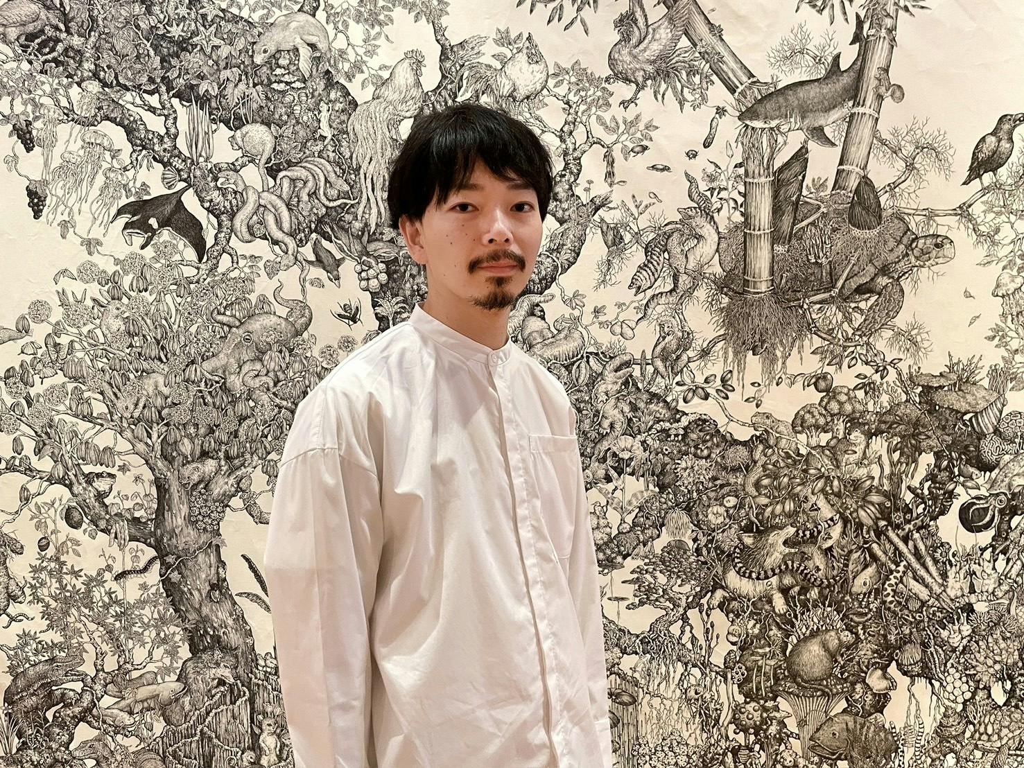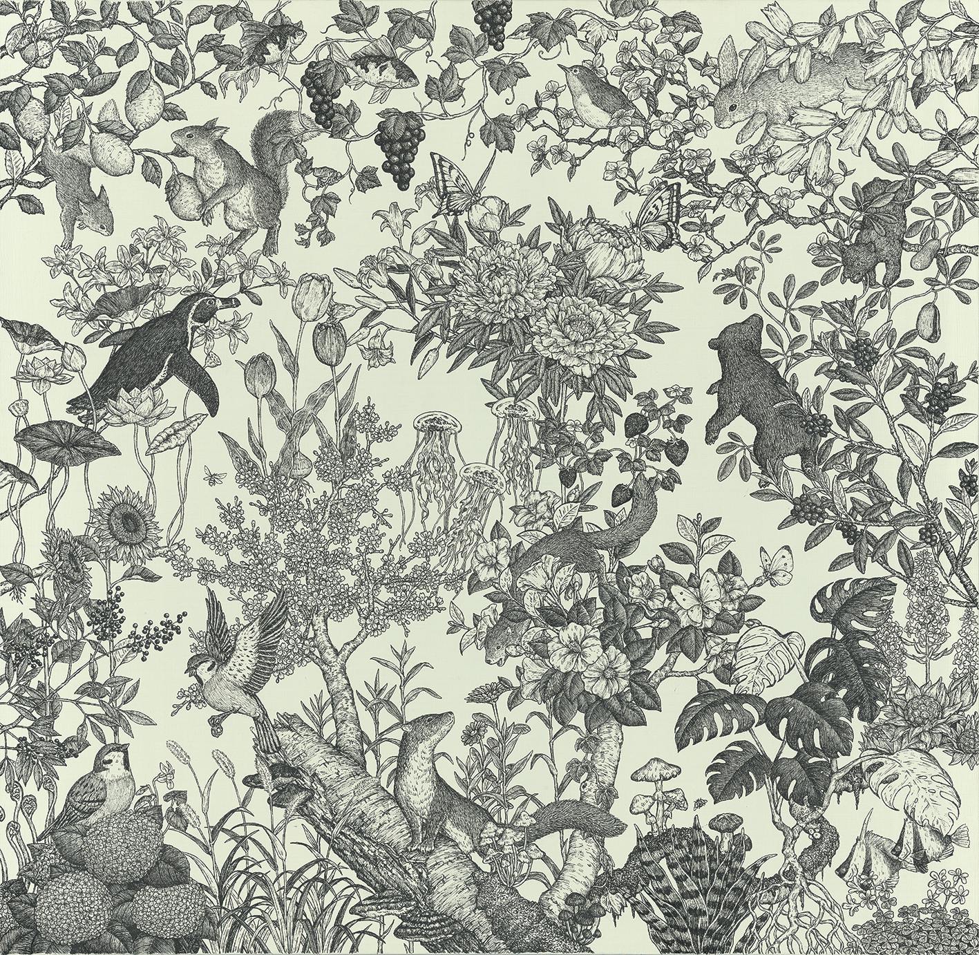 私は普段から、様々な生き物が交錯する自由で調和した世界を描いています。それは子供の頃から、多くの生き物や自然に触れてきた中で感じたことでした。同時に自然の持つ生命力にも惹かれ、それらを表現しようとしています。今回の作品でも、花の美しさや動物の愛らしさだけでなく、その内側に宿る力強さも描きたいとペンを取りました。一つ一つ線を重ねることで生き物の質感や立体感が浮き上がってくるように、描く対象と向き合う時間が内面まで捉えられるのではと思っています。