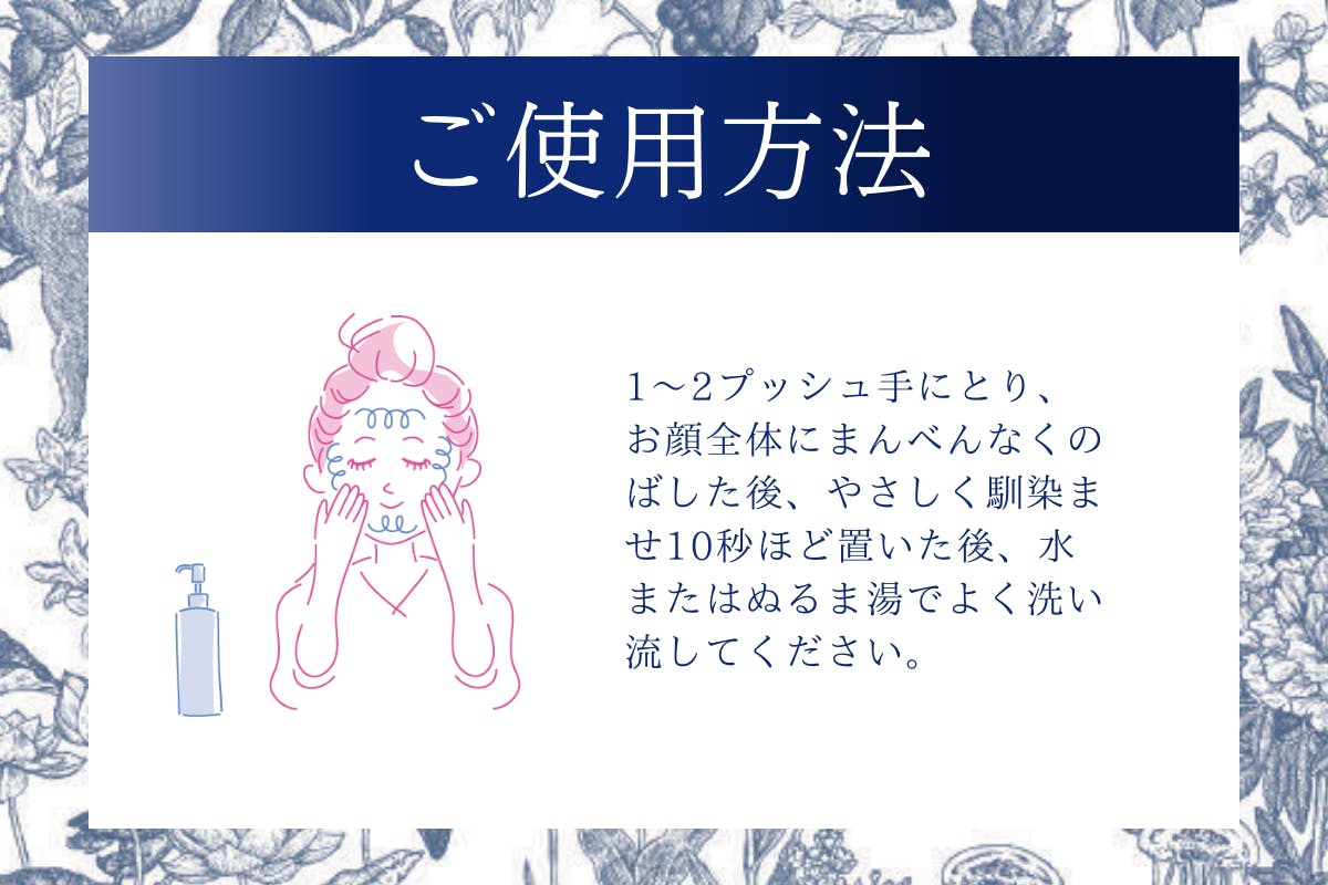 1〜2プッシュ手にとり、お顔全体にまんべんなくのばした後、やさしく馴染ませ10秒ほど置いた後、水またはぬるま湯でよく洗い流してください。最初のロック解除は、まずポンプの根元をしっかり押さえながら、ノズル部分を半時計回りに回すと解除できます。