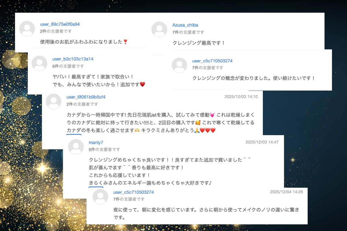 2025/12/10 07:37本プロジェクトもラストスパート!毎日たくさんの方にご支援いただき、支援者総数が930名となりました!!クレンジング販売総数は、なんと1200本!!支援金額も1700万円目前!!皆様の温かいご支援に感謝申し上げます!!すでにお手元に届いた方からは使用感にお喜びの声とともに、怒涛のリピート買い、ストック買いをいただいており、大変ありがたいことにクレンジングつきリターンの完売が相次ぎ、スタッフ一同嬉しい悲鳴を上げています。一度お使い頂ければわかるやみつきになる使用感。癒される香りも大変ご好評をいただいています。化粧箱入りの120ml入りの小ボトルは、クリスマスの贈り物にもぴったりです。すでにご使用いただいたお客様からも、お母様やお友達へのプレゼント用に追加購入をいただいたとの嬉しいお声を多数いただいております。今、クラウドファンディングでご購入いただくと、クリスマス前にお届けできますので、ぜひご利用ください。フェイシャルパックとのご使用でさらに美肌に昨年発売された花瑞肌istBIOハリリフトパックも大変ご好評をいただいており、多くの方にご愛用いただいております。高濃度美容液をたっぷり含んだプルプルのフェイスパックは、お肌が美容液をごくごく飲むような高浸透の使用感と、翌朝まで続く潤いとハリ。1枚のご使用でも変化を感じていただける自信作です。リバイタルクレンジングとのご使用で、さらに美しいお肌を手に入れてください!BIOハリリフトパックも、クラウドファンディングだけのクレンジングとのお得なセットとしてリターンをご提供しておりますので、ぜひこの機会をお見逃しなく!!長くお使いいただきたいからこそ大容量ボトルもお得に!使えば使うほど美しいお肌が育つこのリバイタルクレンジングをみなさまに長くご愛用いただきたいので、300ml入りの大容量ボトルのセットも大変お得にご用意しました!すでにご使用いただいた方からのリピート買いが殺到しており、多めにご用意していたリターンも残りわずかとなってまいりました。クラウドファンディングの性質上、完売後のリターンは少しずつ値上がりしていきます。お気に召していただけましたら、ぜひ、このクラウドファンディングのお得な期間にお買い求めください!FINAL ゴールは2000万円!!みなさまにたくさんの応援と後押しをいただいて全力で走ってきた本プロジェクトも残り3日となりました。全国でのPOP-UP出店で、応援してくださっているお一人おひとりにお会いする日を目標にFINAL ゴールは2000万円!応援してくださるみなさまと最高のゴールテープを切るべく、最後の1秒まで全力で走り続けます。皆様のお一人おひとりの応援が、この挑戦を現実にしていきます。どうか引き続きのご支援・ご声援をよろしくお願いいたします! もっと見る