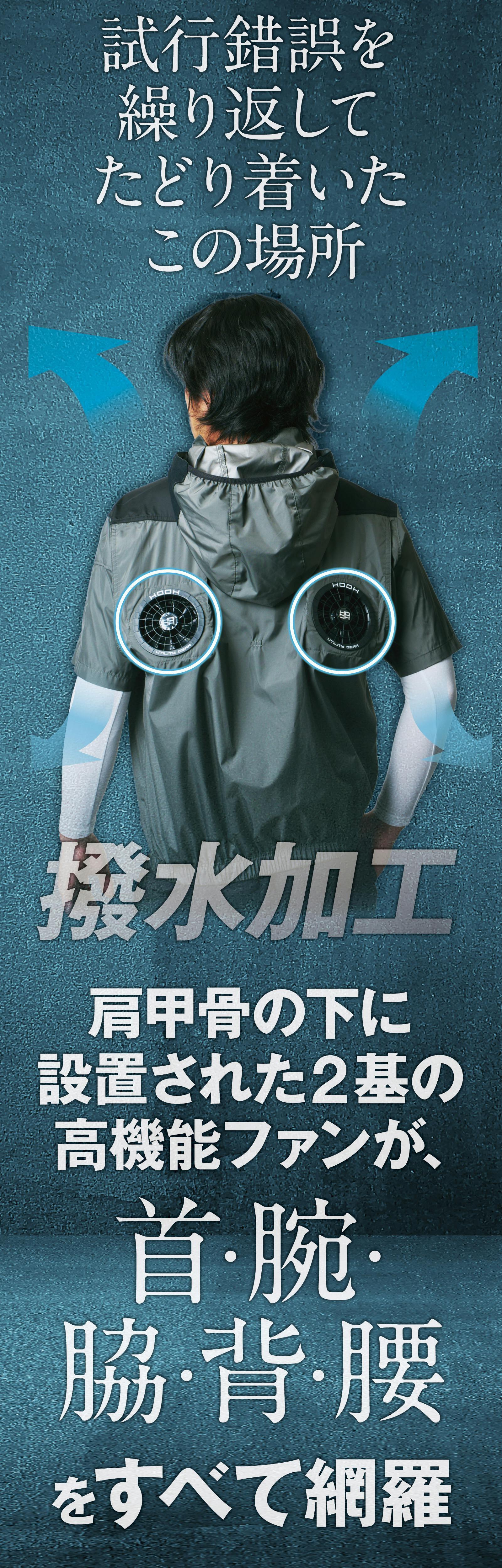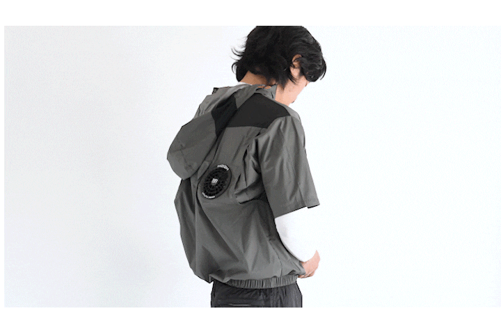従来は脇腹や腰のあたりに設置するのが一般的だった「ファン」を、左右の肩甲骨の下あたりにレイアウトすることで、さらなる涼感をアップ。皆さまの常識を覆す、新発想のファン付きウェアとなっています。