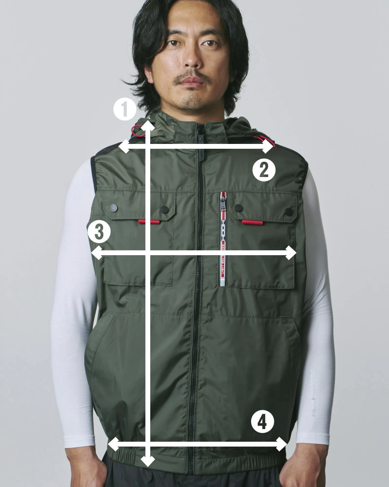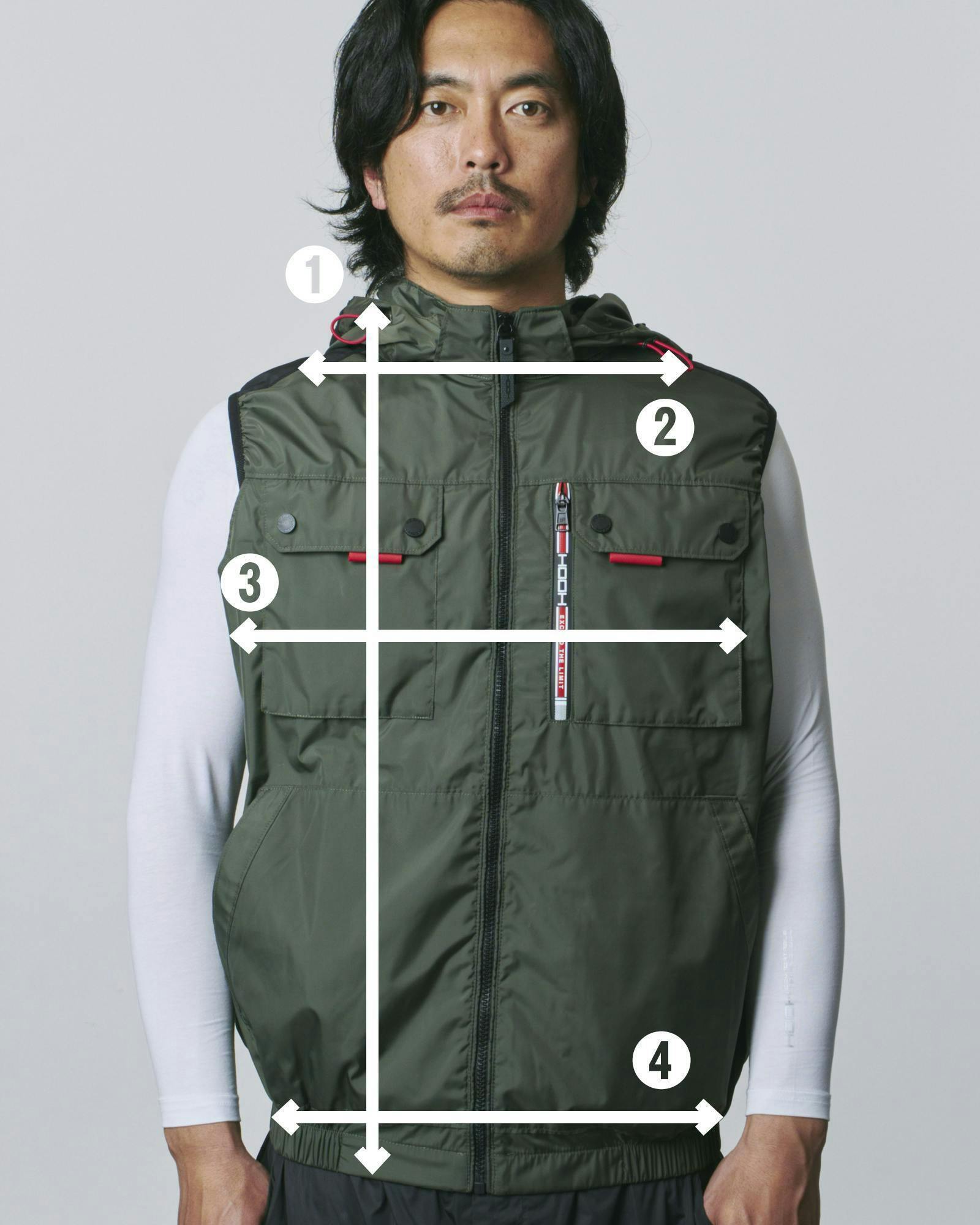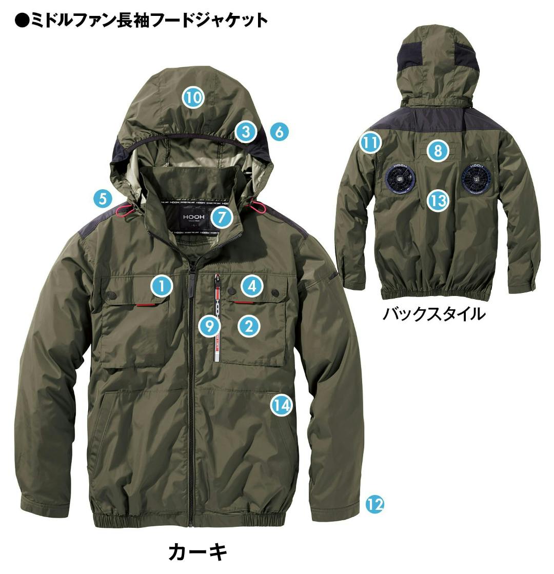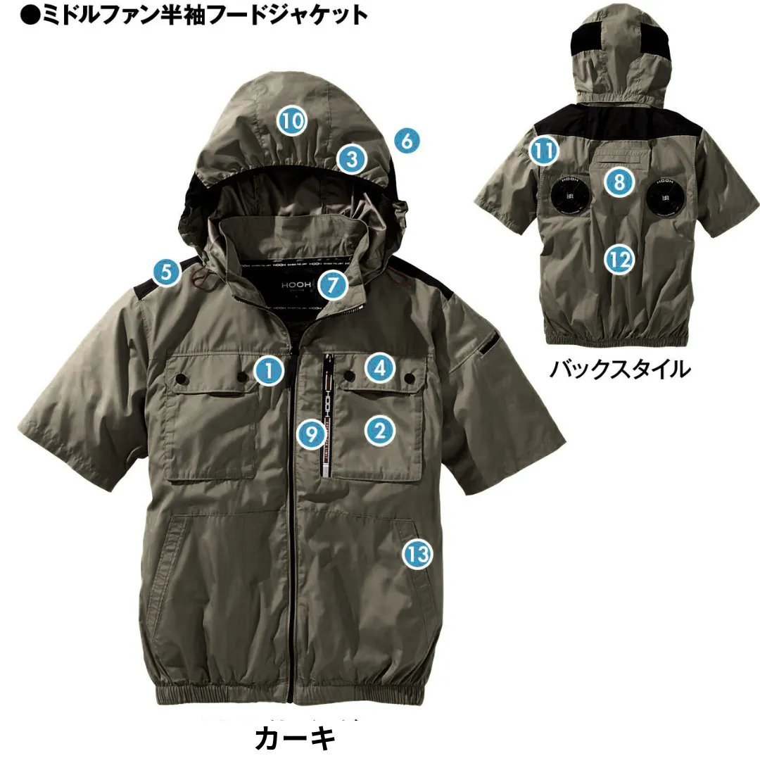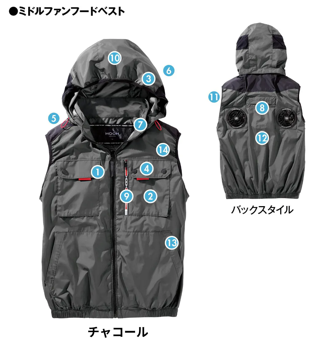ミドルファンフードジャケット&フードベストでは、その名の通り背面のほぼ中央、肩甲骨の下あたりに2基の高性能ファンを設置。