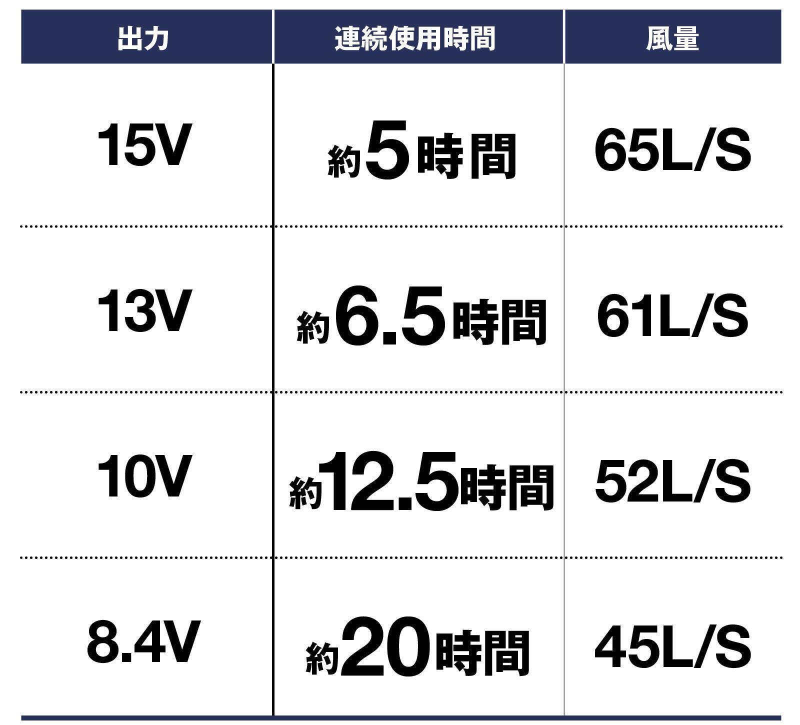 最大風量:15V/毎秒65L。