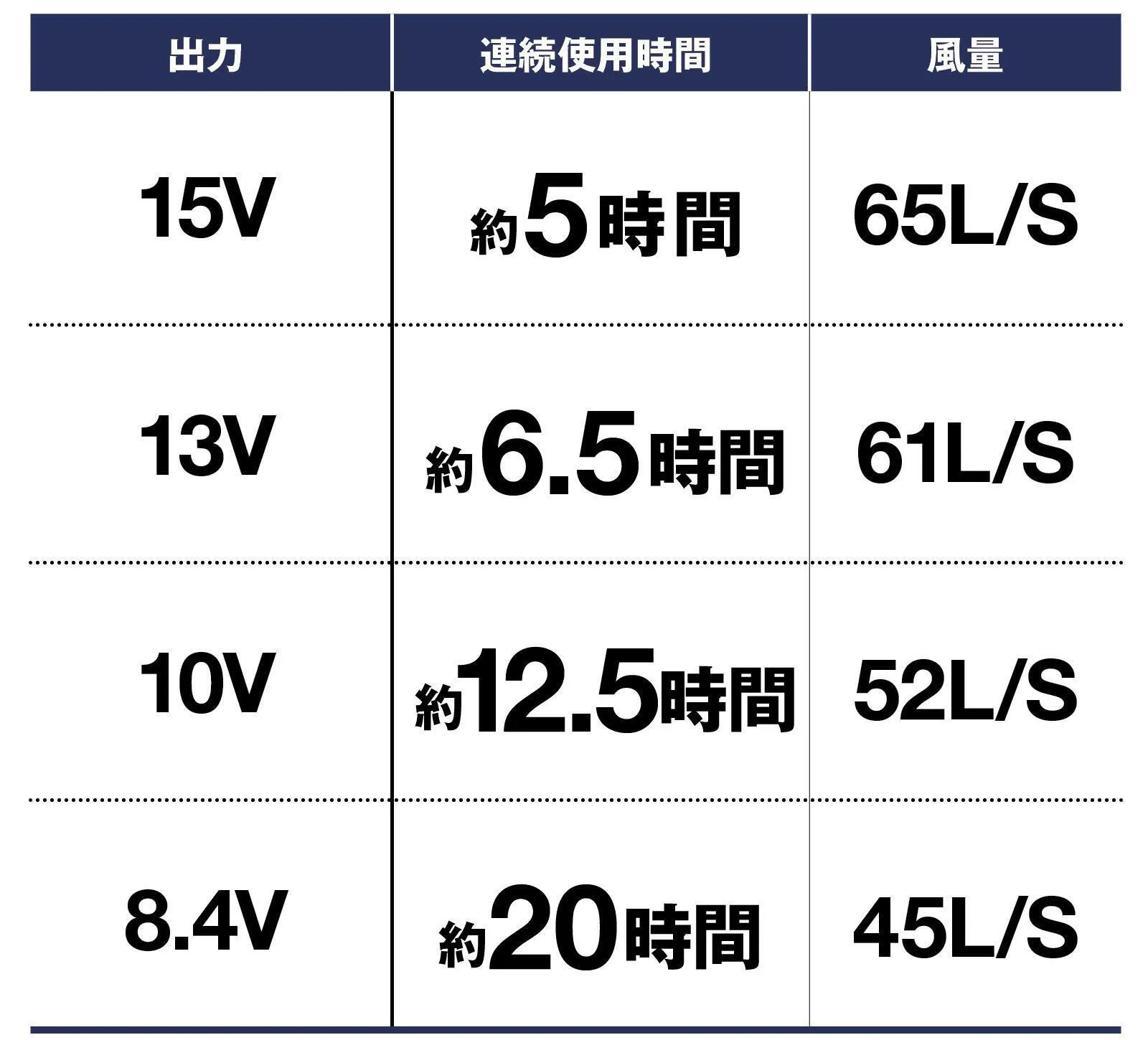 ミドルファンフードジャケット&フードベストのリチウムポリマーバッテリーは20000mAhの大容量。最長連続稼働約20時間を誇ります。