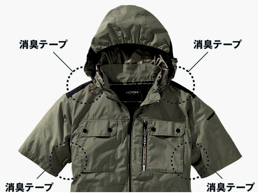 そもそもニオイは、汗で湿った状態を放置することで、雑菌が増えることにより発生します。ファン付きウェアは汗を吸湿してすぐに気化熱として放出するので、元からニオイにくいという特徴があります。その上で、首元や脇の位置に消臭テープを編み込んでいるので、ニオイ対策は万全。思い切り夏を楽しみましょう!