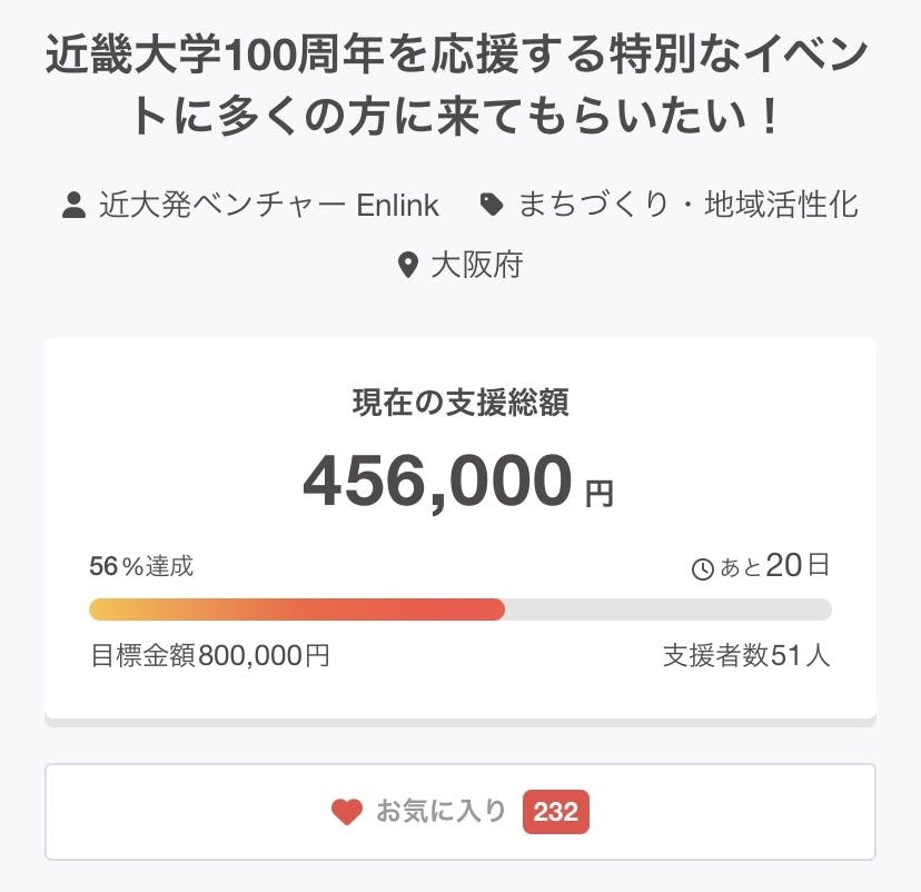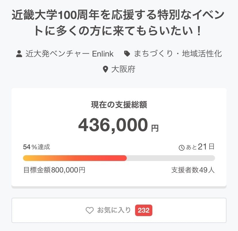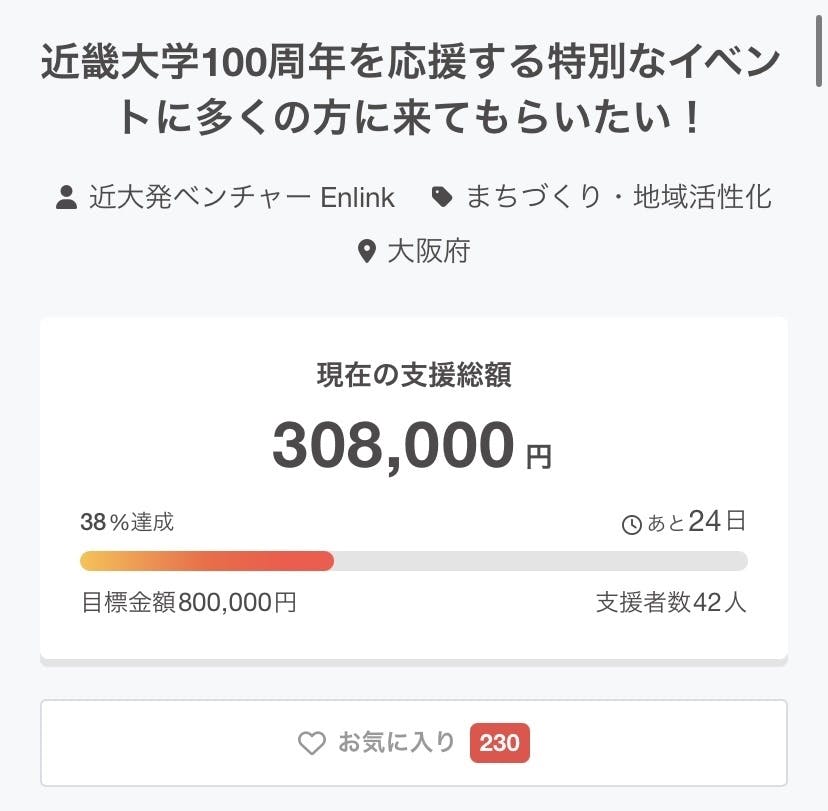初めてのクラウドファンディング。ご支援の募集を開始してから7日目を迎えました。本日は45万円を達成することができました。イベントでたまたま出会った近大OBの方からその場でご支援いただけるなど、本当に大感謝の1日となりました。次は50万円目指して頑張ります。引き続き、ご支援とシェアをどうぞよろしくお願い致します。