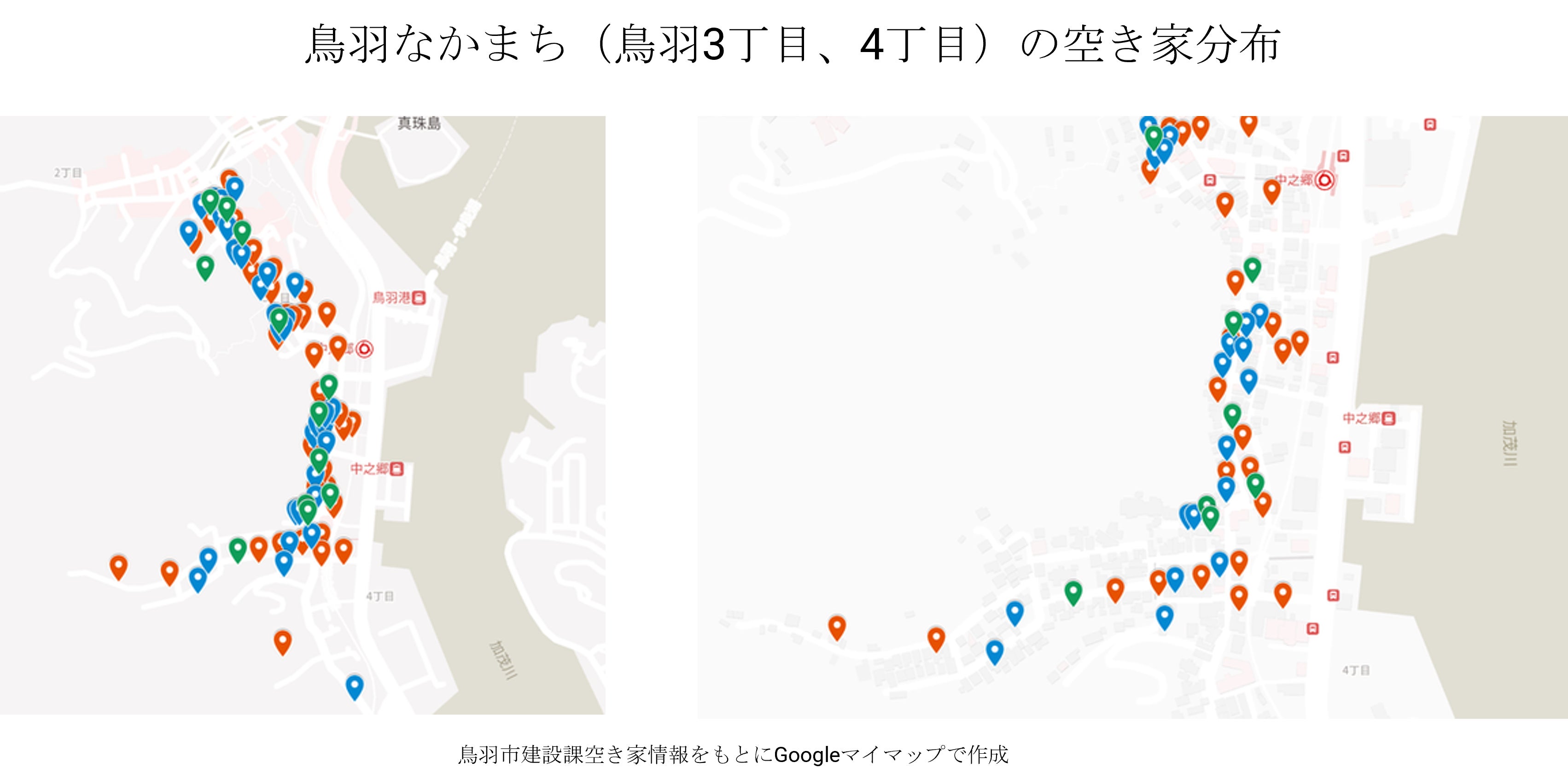 また、地方特有の課題として、相続登記や土地登記が曖昧なため、活用したくても出来ない。新たに活用したい人がリスクと感じて何も動けないという現状があります。鳥羽なかまちの家屋の特徴として少ない土地を上手く活用するためウナギの寝床のような長屋づくりで隣の家と外壁を共有しています。