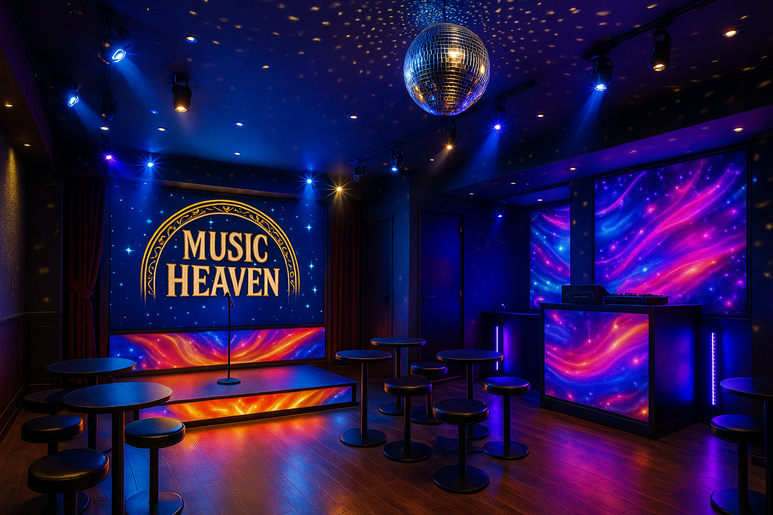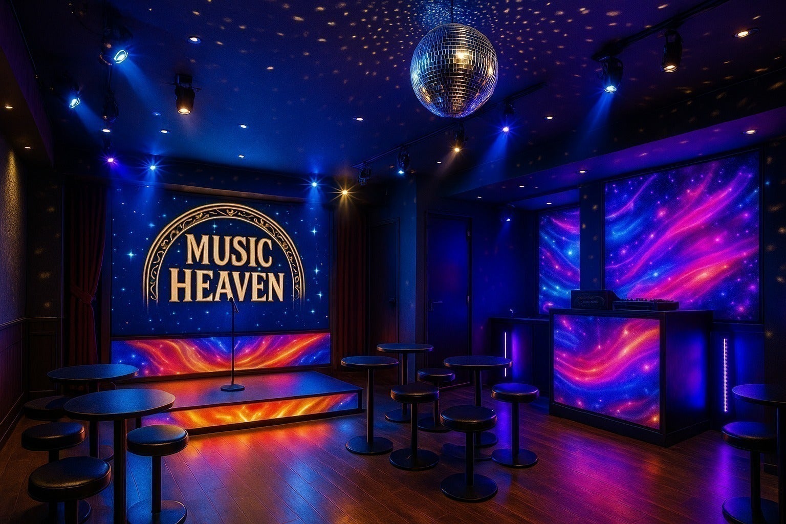 壁・ステージ下・バーカウンター背面などに大型LEDパネルを設置し、
