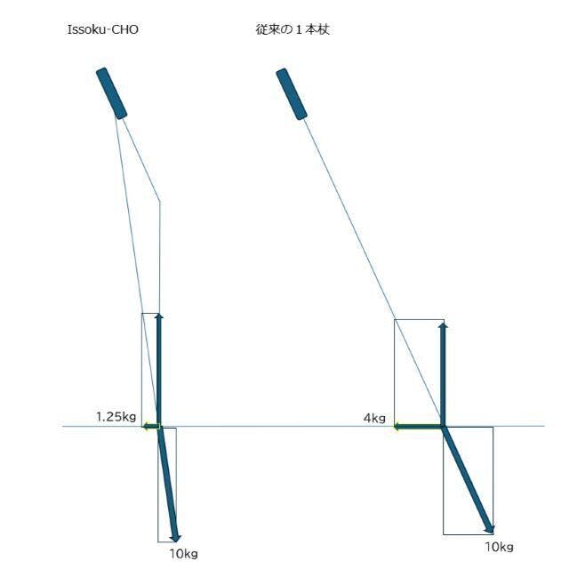 10kgの荷重をグリップ部にかけた場合、真っ直ぐなポールは約4kgの摩擦力が必要です。それに対してIssoku-CHO(1足長)は約3分の1の1.25kgの摩擦力で済みます。そのため、Issoku-CHO(1足長)の使用者が「ポールの先端が滑りにくい」「先が逃げない」とおっしゃるのはそのような理由です。