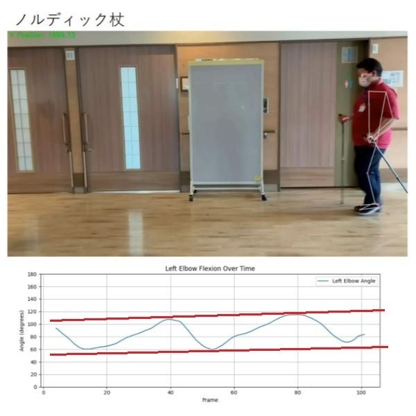「グリップから1足長下の位置で、杖の先端が1足長前方になるように曲げること」によって、ポールの先端と足の位置が近くなります。そのことによって、手と足のリズムが合いやすくなります。そして、手と足で同時に地面を押すことができるので、推進力が得やすくなります。身体のエネルギーを有効活用できるので、より長い距離をより早く歩いたり、走ったりすることが可能です。