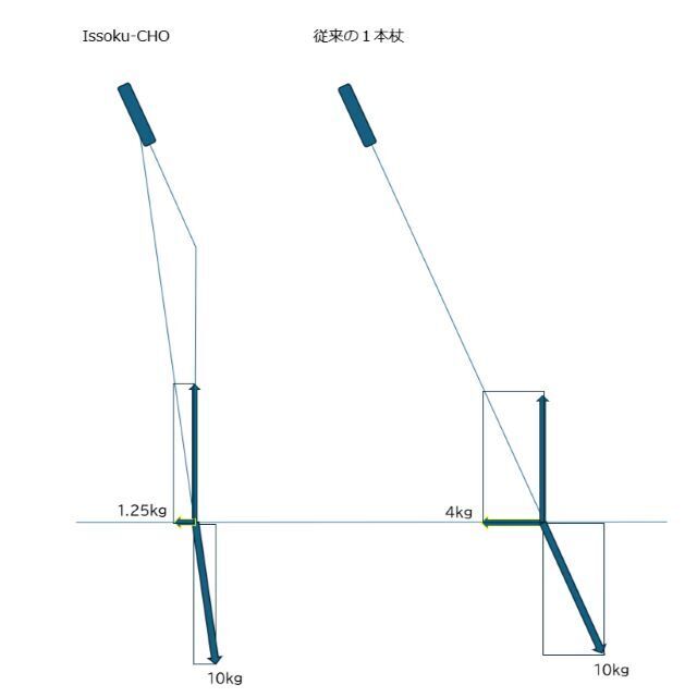 10kgの荷重をグリップ部にかけた場合、真っ直ぐなポールは約4kgの摩擦力が必要です。それに対してIssoku-CHO(1足長)は約3分の1の1.25kgの摩擦力で済みます。そのため、Issoku-CHO(1足長)の使用者が「ポールの先端が滑りにくい」「先が逃げない」とおっしゃるのはそのような理由です。