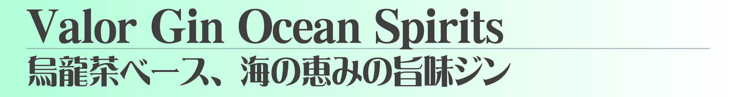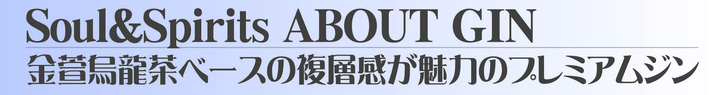 ニュートラルかつ少し甘味のあるライススピリッツをベースに、爽やかで心地よい熱帯柑橘と温かいジュニパーの含み香のあと、金木犀の華やかな香り、烏龍茶の奥深い「茶韻」が加わり、優しく複雑なアロマが生まれます。45%のアルコール度数を感じさせない、驚くほどの「滑らかさ」。