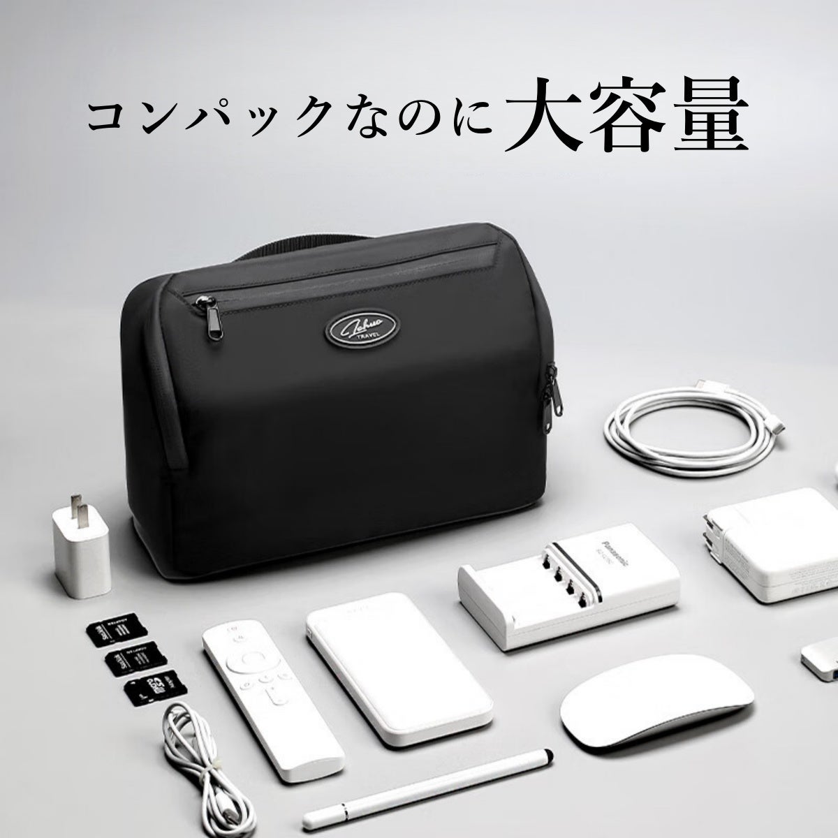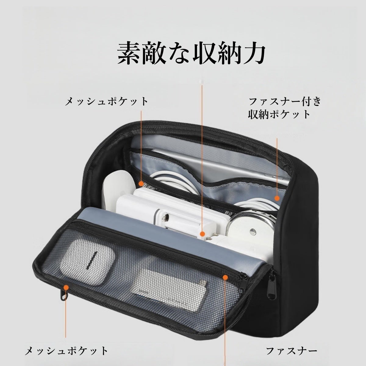 モバイルバッテリー、充電ケーブル、イヤホン、ゲーム機などのガジェット類や小物を収納するコンパックなのに多機能&大容量ポーチです。