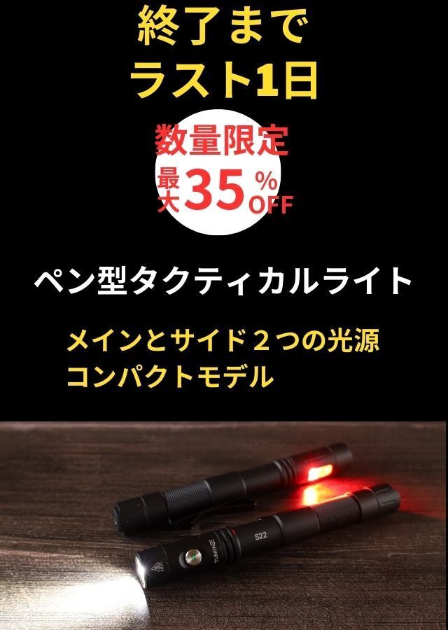 本プロジェクトも残り1日となりました。「【メインとサイド】頼れる2つの光で闇夜を照らす。1円玉より細いLED懐中電灯」おかげさまで多くの皆さまにご支援いただきメーカー共々大変感謝しております。皆様本当にありがとうございます。メインライトは、細見のボディながら最大で1200ルーメンの明るさ。しっかりと暗闇を照らします。サイドライトは、発光部分がしっかりとあるためサイドと思えないほどの明るさを有します。黄色はランタン灯として、赤色は、植物観察などに。UVライトは見えない汚れ発見やお掃除に。マグネットやストラップ、クリップなど充実したアクセサリーも魅力です。通常の懐中電灯にはない機能が備わった、S22懐中電灯。ぜひ、一台は手元に置いておきたいアイテム、関連動画の方をチェックされていない方は、覗いてみてくださいね。https://www.youtube.com/watch?v=bo9-SOF0Ei4それでは、最後までよろしくお願いいたします。