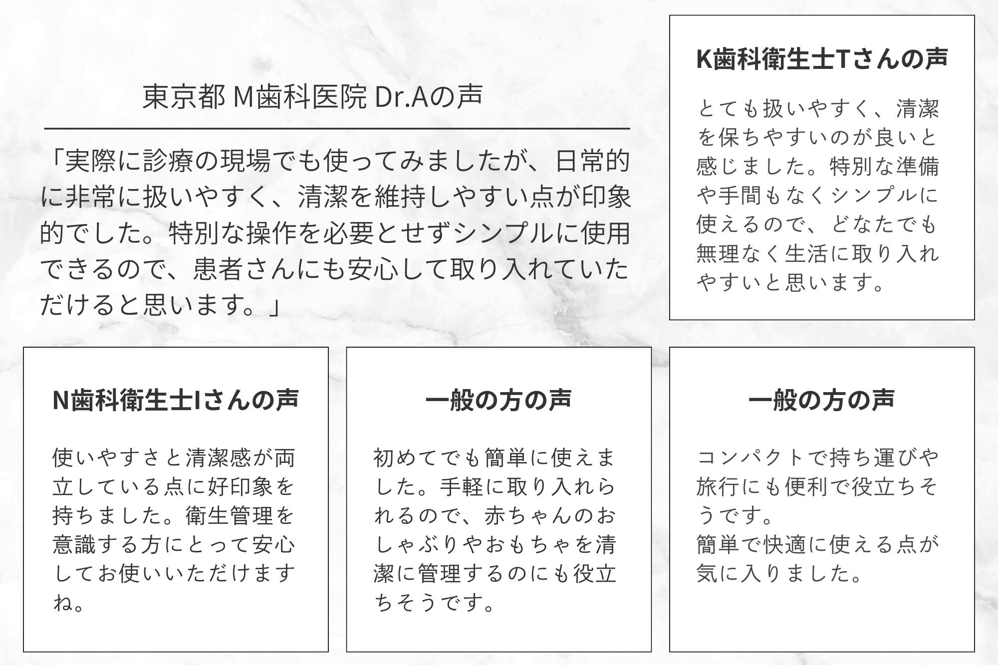 ここで東京都で開業されている某歯科医院の先生や衛生士さん、モニターとして一般の方にご使用いただき、率直な声をいただきました。