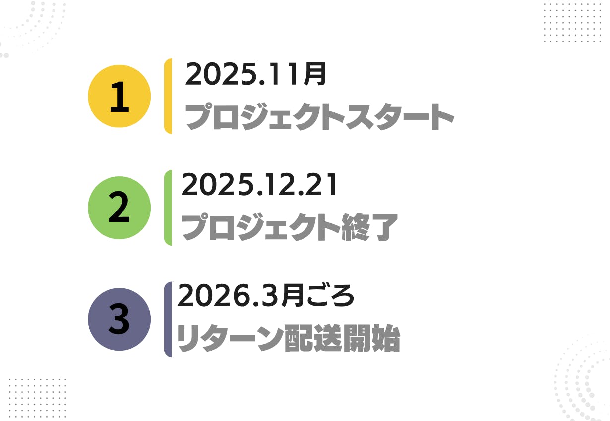 ※本文中に記載させていただいたスケジュールは、あくまでプロジェクト公開時点の予定です。クラウドファンディングの性質上、配送遅延のおそれがございます。
