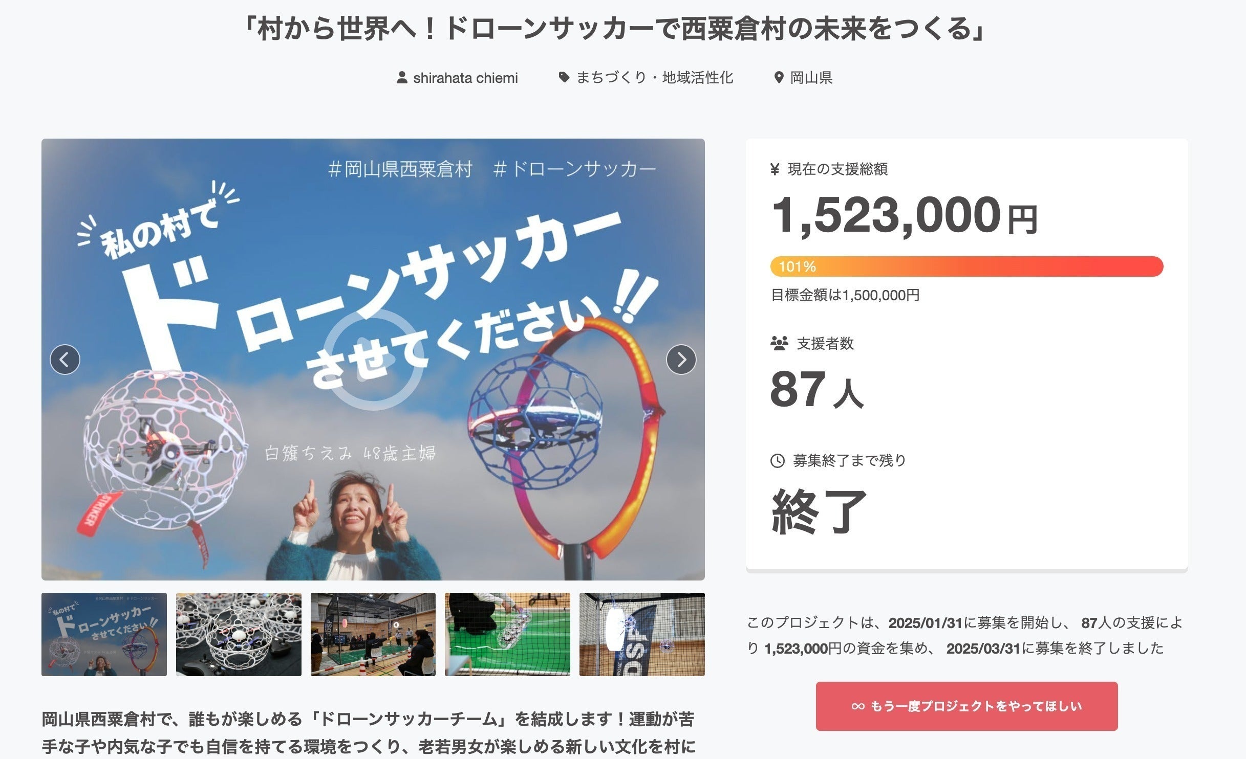 社会人・小学生・経営者が「村から世界へ」を合言葉に、毎週 2〜3 回の練習を重ねています。前回クラファンで頂いたご支援でドローンサッカー機材の調達と練習場の整備を完了し、日本選手団として世界大会出場への挑戦権を獲得しました。