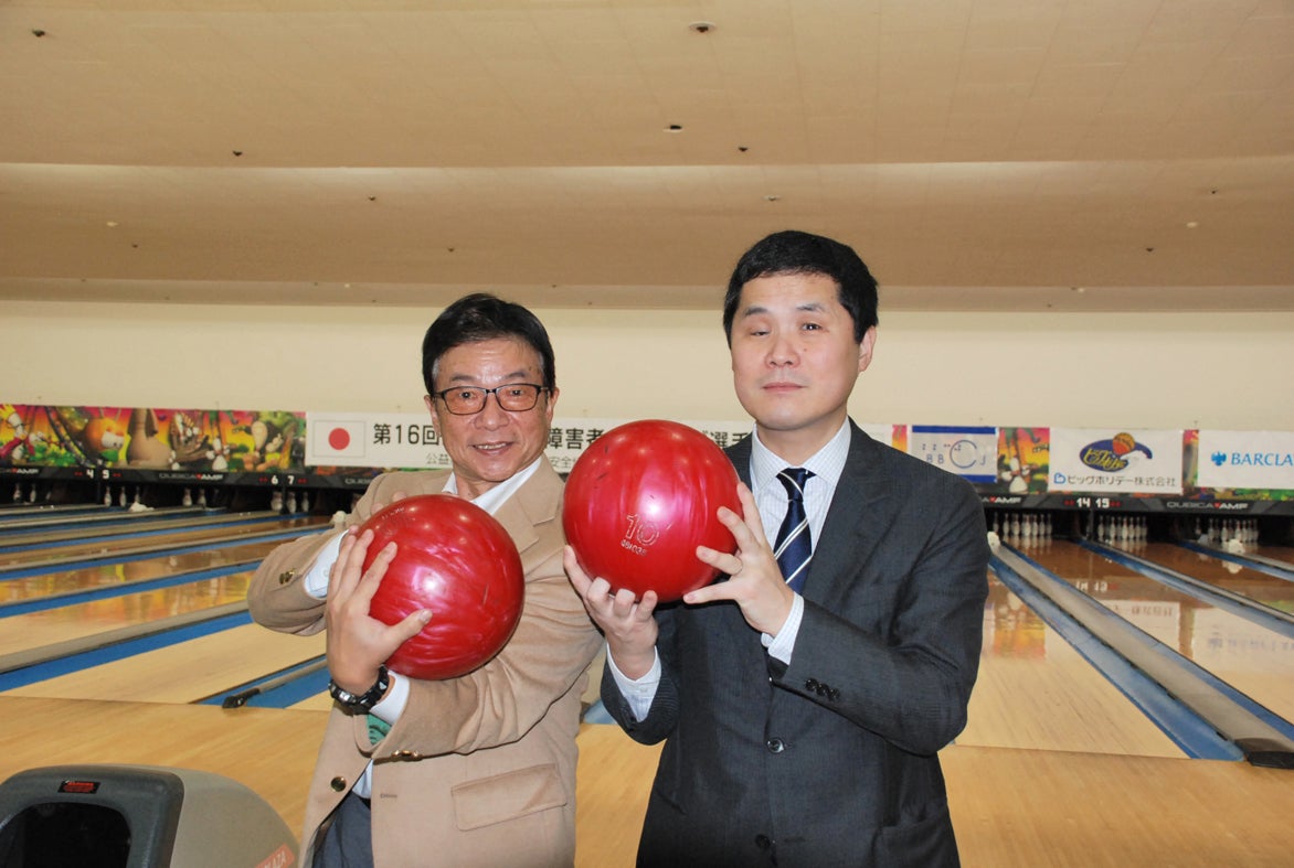 <一般社団法人全日本視覚障害者ボウリング協会 会長 青松利明(右)>