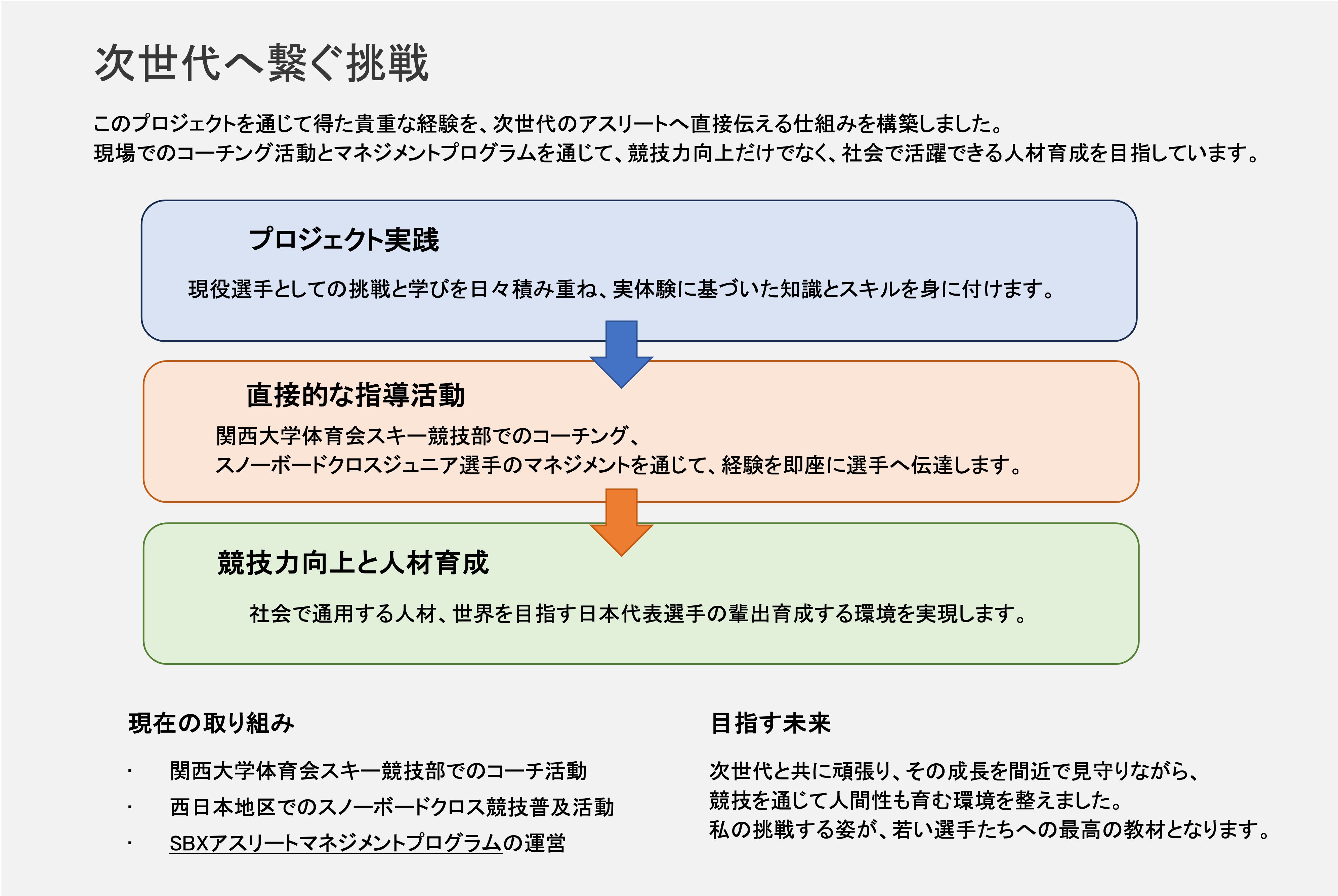 また、今年度より「SBXアスリートマネジメントプログラム」を立ち上げ、スノーボードをスポーツとして取り組むジュニア選手をマネジメントし、自身の活動を通した経験を次世代に伝える取り組みも同時に進めています。