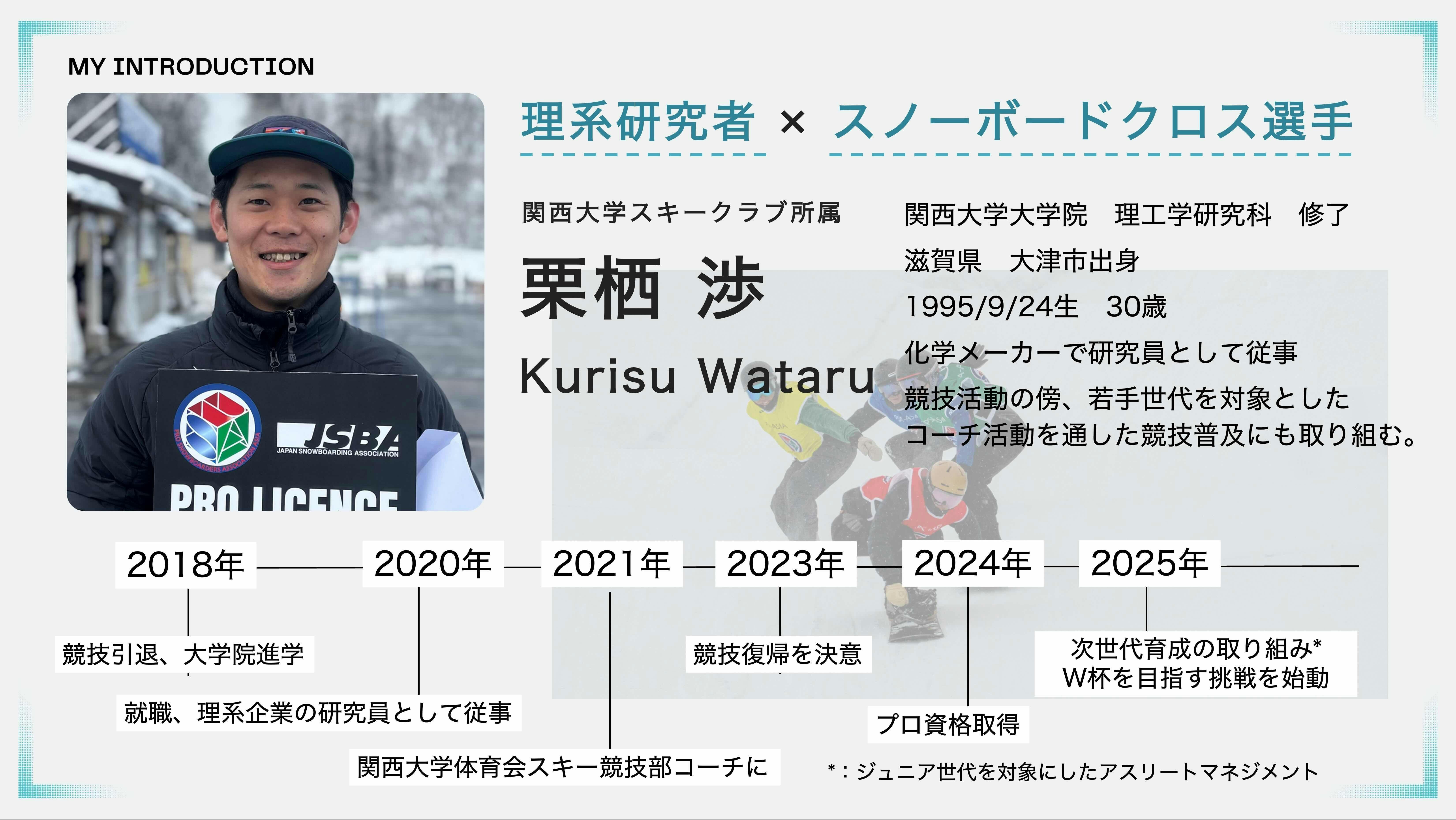 化学業界の企業で理系研究開発職に従事する傍、社会人アスリートとしてスノーボードクロスという競技をしています。