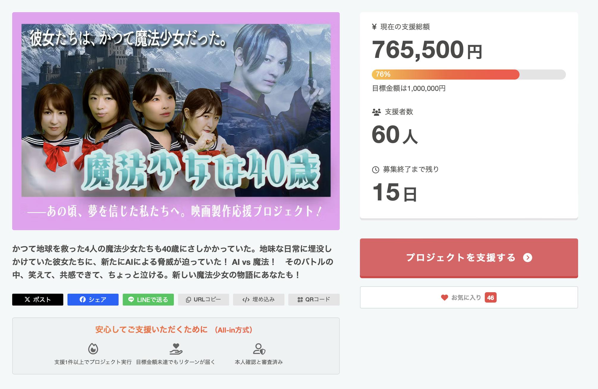 76%突破いたしました!ご支援者さまはのべ60名となりました!ありがとうございます!