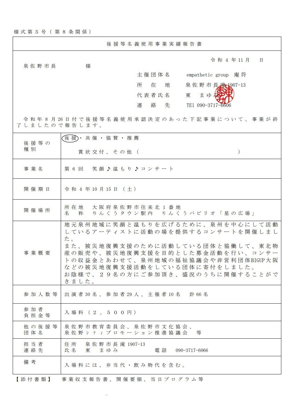 また、empathetic group 庵符 様におかれましては、泉佐野市をはじめとする泉州各地において、地域活性化のための音楽イベントにも積極的に取り組まれており、地域に賑わいを届けてくださっております。