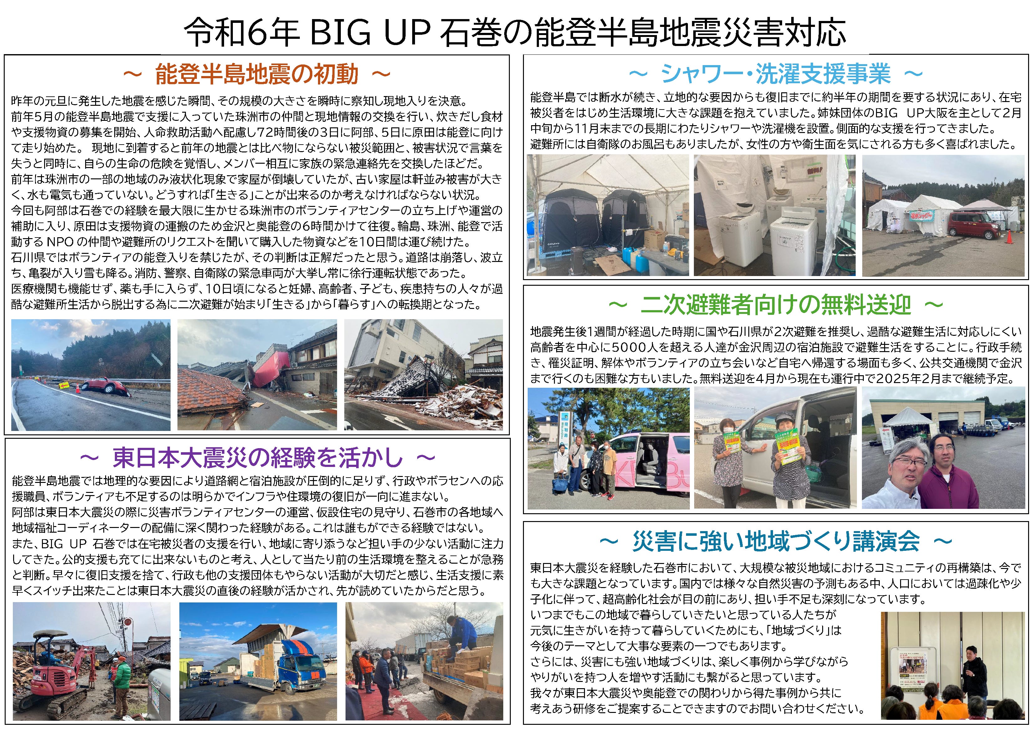 最後の開催となる今年のコンサートでは、被災地で過酷な状況の中、暑さ・寒さ・数々の困難と闘いながら支援を続けておられるボランティア団体「一般社団法人 BIG UP 石巻」様に集まった支援金を寄付し、能登での災害地支援にお役立ていただければと考えております。