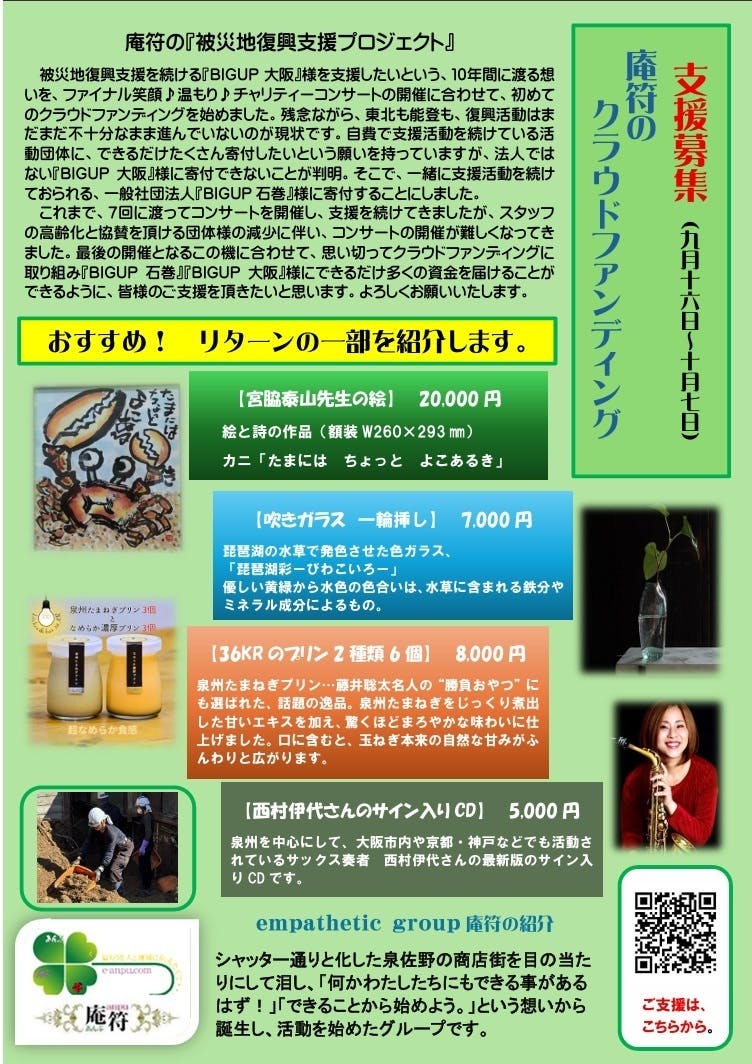 とうとう念願のプロジェクトを、本日(9/16)、ついに始めることができました。スタッフ一同、喜び合っております。また、クラファンのチラシも出来上がり、本日より配布いたしております。本日始めることができたのも、本当にたくさんの方々のご協力とご支援のお陰だと改めて心に感じています。ありがとうございます。また、CAMPFIREの担当者の渡辺さんには、本当に親身になってご支援くださり、心より感謝申しあげます。ありがとうございます。さて、開始早速4名の方からご支援を頂きました。驚きと喜びがひとしおです。・絵手紙作家 宮脇先生の絵が一番でした。流石です。あと、残り2点です。・カフェ遊夢さんのプリンDEケーキが2番目です。とても美味しいです。が、完売です。 ところが急遽、増やしてくださる連絡を頂いています。少しだけ、お待ちください。・3番目、4番目は、ガラス工房 glass imecaさんの吹きガラス。 本当に素敵な一輪挿しです。残りは28点です。4名の方々、本当にありがとうございます。支援頂く期間が短いので、少し不安があります。しかし、今この時も被災地復興支援をされている方々は、暑さの中で頑張っておられるのです。少しでも応援の方々を増やし、たくさん寄付を頂けるよう頑張っていきたいと思います。どうぞよろしくお願い致します。 庵符スタッフ一同