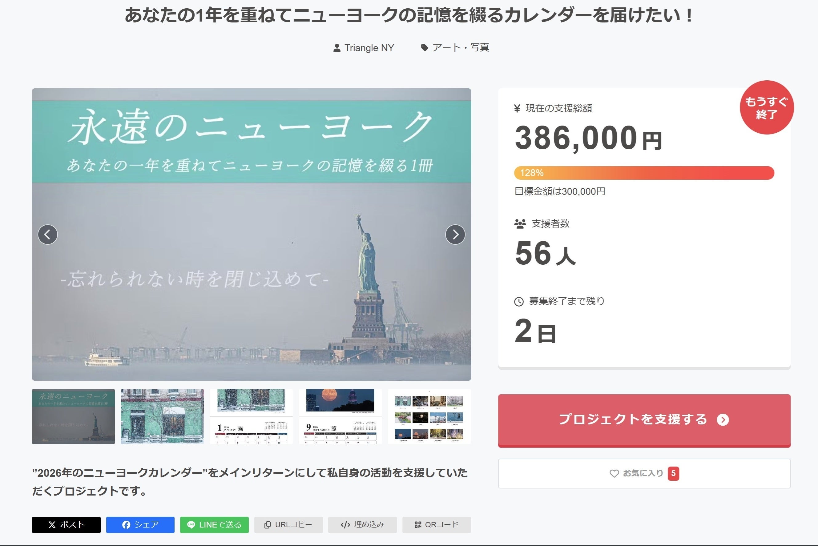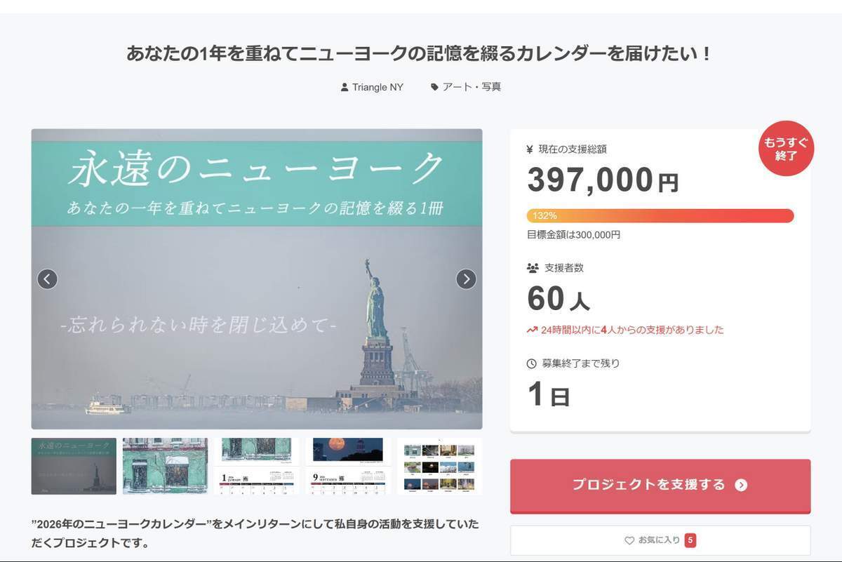 皆さま、今年もクラウドファンディングプロジェクトが無事終了しました!まずはご報告、この6年間でクラウドファンディングカレンダープロジェクトを続けてきて、今年は64名の支援者の方々に応援していただき”歴代2位”の記録になりました、誠にありがとうございました。第1位:2020年109名第2位:2025年64名第3位:2023年62名 これは全て、皆さまのご協力やご支援によるものです。カレンダースポンサーになっていただいた方、直接サポートしていただいた方、ご友人のプレゼントとして参加された方、プロジェクトをシェアしていただいた方、口コミで広めていただいた方、過去のプロジェクトに参加していただいたきまたリピートしていただいた方、プロジェクト準備から発送まで関わっていただいている方々など、多くの方に支えられて無事達成できました。小さなプロジェクトで、毎年「1歩」前に進み、自分自身の活動を継続して広げ、私の作品で皆さまを元気づけ、「ニューヨークでこんな活動をしている日本人フォトグラファーがいるんだ」と知っていただくきっかけになれば幸いです。世界を見れば、円安、長引く戦争、関税に伴うインフレ。アメリカは、滞っていた政府予算も来年1月までの予算を確保する「つなぎ予算」としてようやく可決され、ニューヨークは市長も変わりました。この1年で様々なことが起こり、不安定な状況は依然として続いておりますが、皆さまのサポートを受け、2026年はニューヨークでもう1歩先へ進めるよう頑張ります。今年も残すところ1か月強となりました。皆さまが素敵な2026年を迎えれることを願っております。今年もありがとうございました。Triangle NY植山 慎太郎