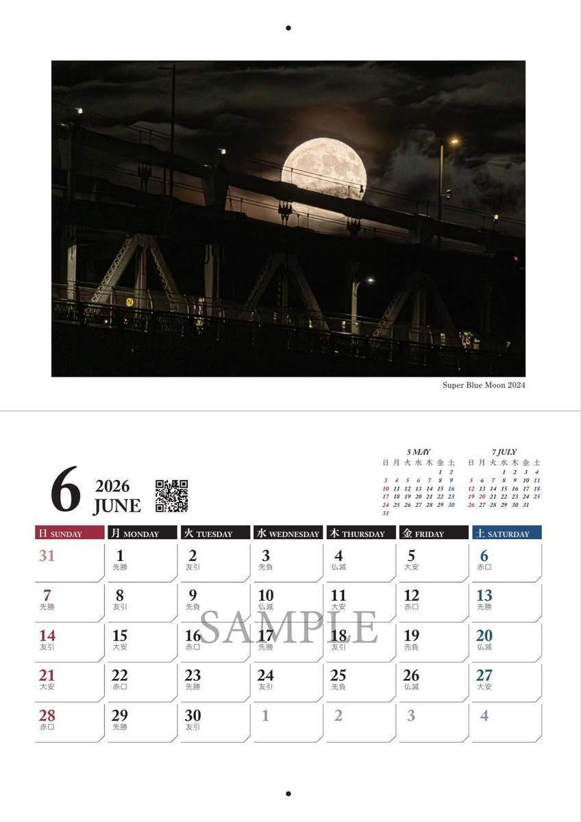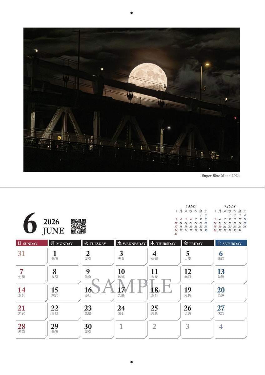 そしてこのカレンダーの象徴とも言えるのが、2011年から撮り続けているテーマ「月とニューヨーク」。ニューヨークの地下鉄と一緒に写し込んだスーパームーン、ビルの谷間に昇る中秋の名月、ブルックリンブリッジに向けて見上げる月の出——どれも時間が止まったような瞬間を纏っています。このシリーズは、私が最も大切にしている“ニューヨークのもうひとつの顔”です。