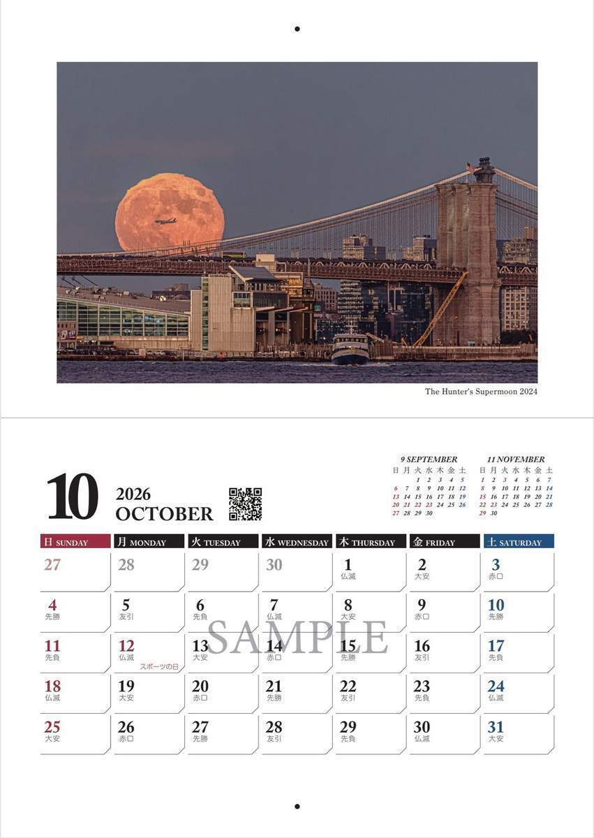 そしてこのカレンダーの象徴とも言えるのが、2011年から撮り続けているテーマ「月とニューヨーク」。ニューヨークの地下鉄と一緒に写し込んだスーパームーン、ビルの谷間に昇る中秋の名月、ブルックリンブリッジに向けて見上げる月の出——どれも時間が止まったような瞬間を纏っています。このシリーズは、私が最も大切にしている“ニューヨークのもうひとつの顔”です。