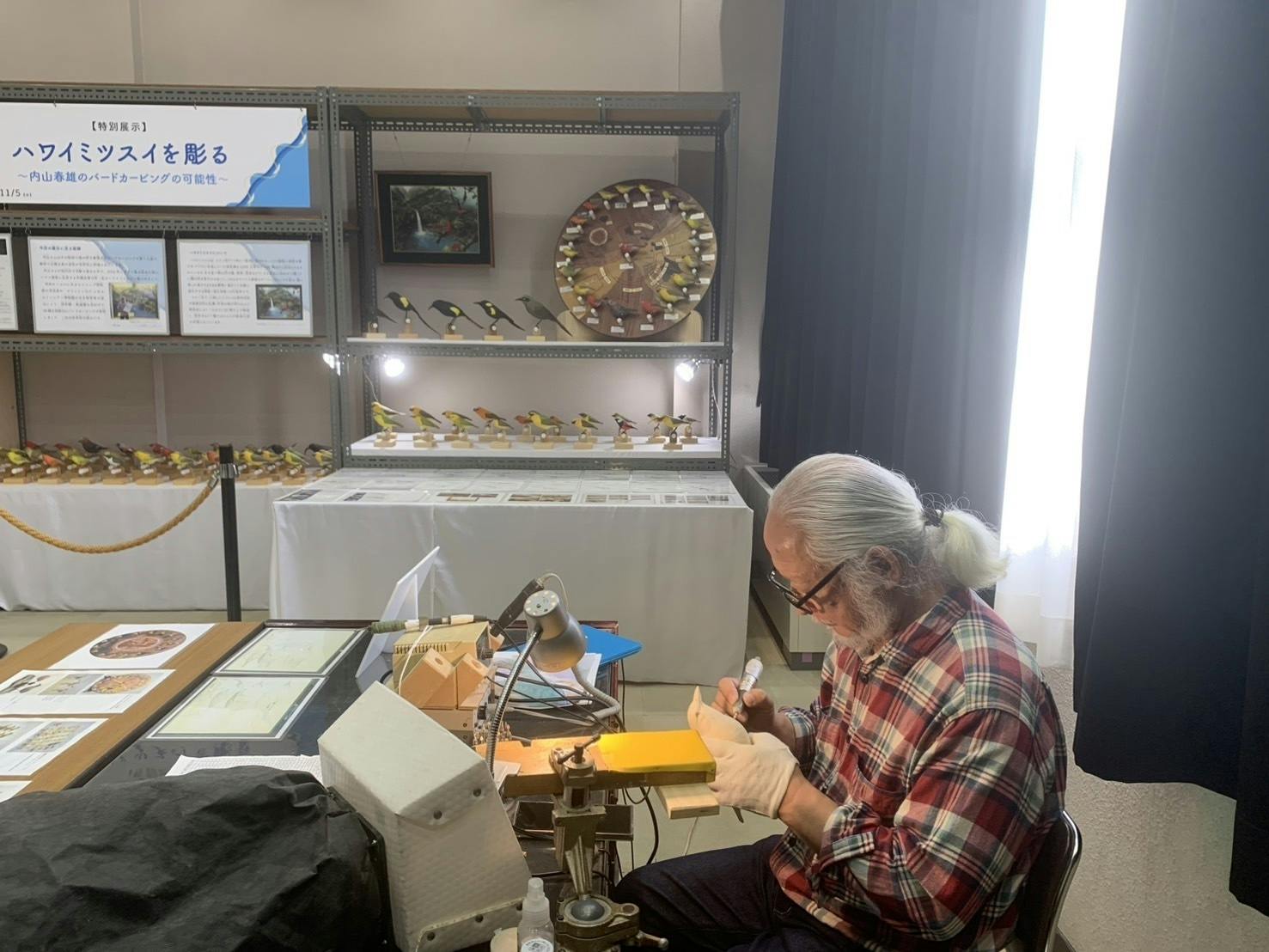 「鳥の博物館に触って・聞いて楽しめる鳥の鳴き声装置を設置したい!」プロジェクトを公開してから4週間が経ちました。これまで20名の方よりご支援をいただき、達成率は17パーセントとなっています。本当にありがとうございます!鳥の博物館では、10月18日(土)から11月5日(水)鳴き声装置の鳥のカービングを手掛けてくださる内山春雄さんの作品展「ハワイミツスイを彫る~内山春雄のバードカービングの可能性~」を開催中です。内山さんのバードカービングは、繊細な彫刻による羽毛の表現や、実際の鳥への再現度の高さが世界的に評価されています。今回の展示では、内山さんが2016年から制作されている、ハワイで独自の進化を遂げた「ハワイミツスイ」のカービング作品を一挙に並べています。現在では絶滅した種類も、現地の博物館に残された骨の一部や剥製をもとに生きている姿を復元して製作されており、これは世界初の試みです。展示期間中、一部の日程を除き内山さんによる実演を間近でご覧いただけます。特別展示についてはこちらクラウドファンディングは11月28日まで続きます。お知り合いへのご紹介やSNSでシェアしていただけると大きな励みになります。引き続き、応援よろしくお願いいたします!
