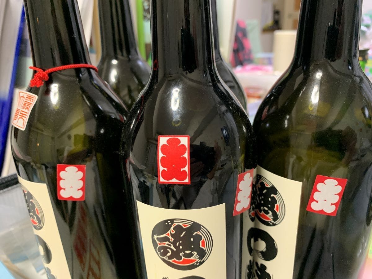お届けした「純米吟醸つきじ」の瓶に貼って、さらに縁起の良いオリジナルボトルに!