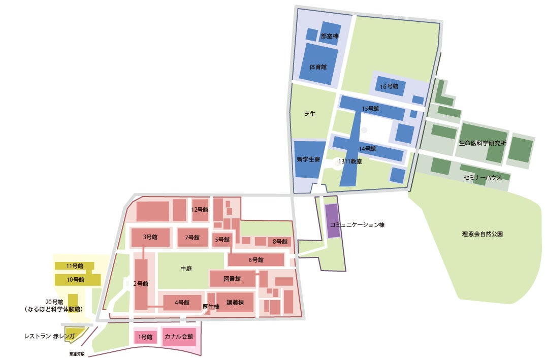 開催地である東京理科大学野田キャンパスは、創域理工学部エリアと旧薬学部エリアに分かれており、豊かな自然に囲まれた広大なキャンパスです。