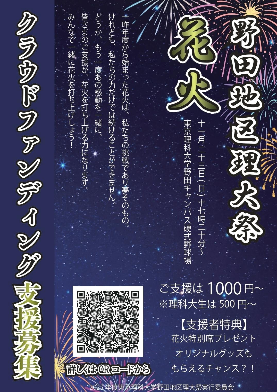 このたび、私たちの野田地区理大祭ではフィナーレを彩る花火の打ち上げを目指し、その資金を募るクラウドファンディングを9月29日(月)より開始いたしました。