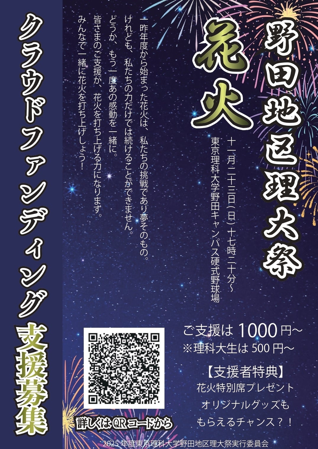 こんにちは。東京理科大学野田地区理大祭実行委員会です!本プロジェクトをご覧いただき、ありがとうございます。そして、ご支援いただいた皆様には、心より感謝申し上げます。花火観覧に関するリターン(特設スペース/特別席)について、当日の受付開始時間や会場のご案内をお知らせいたします。■受付開始時間16時50分より受付開始となります。■受付場所クラウドファンディング受付、観覧場所は、添付のマップの通りです。■入場方法受付にいるオレンジパーカーを着た実行委員へ、ご支援が確認できる画面をご提示ください。確認後、観覧エリアへご案内いたします。なお、花火打ち上げ開始時刻は17時20分を予定しております。今年の花火を、皆様には楽しんでいただけるよう準備を進めております!どうぞ当日は気をつけてお越しください。
