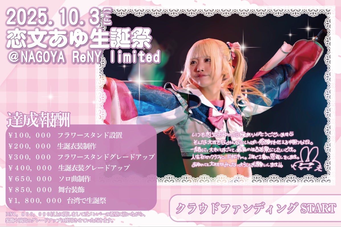 2025年10月3日に名古屋 ReNY limitedで開催されるメンバーの「恋文あゆ」の生誕祭。今回は、彼女の生誕祭を成功させるために、彼女を応援する全てのファンの力を集結させたいと考えています。