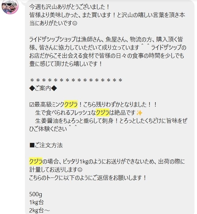 ライドザシップでは、毎朝漁師さんから届く「今日これ獲れたよ!」という情報を、すぐにLINEでお客様に配信しています。