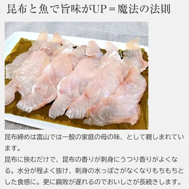 2025/09/27 18:27【富山好き必見!】旬の魚で作る手作り昆布締めセット 立山連峰の雪解け水と日本海の潮が混ざる、富山湾。 その豊かな海で獲れた新鮮な魚を、1枚1枚丁寧に手作業で昆布締めにしました。 富山の方からも「贈り物にしたい」と選んでいただける、ライドザシップ自慢の逸品です。 一度食べたら、やみつきになるといわれています。 昆布締めとは? 富山は一世帯あたり昆布消費量日本一。 江戸時代から続く昆布文化の中で、魚の旨味を凝縮させる食べ方として愛されてきました。 魚の余分な水分を抜き、身を引き締め、昆布の旨味がじんわりと染み込みます。 富山では魚だけでなく、肉・野菜・かまぼこも昆布締めで楽しみますよ^^私はよくお土産や自分のご褒美に、誰かとのご飯会にと常に冷凍庫にストックしています!すでに刺身状にきってあるので便利なのもおすすめです☺是非、のこり僅か!今回すべての商品をクラウドファンディング特別価格にしておりますので是非こちらお見逃しなくです! もっと見るお気に入り登録はしたものの・・・注文しようか迷っている方へ!