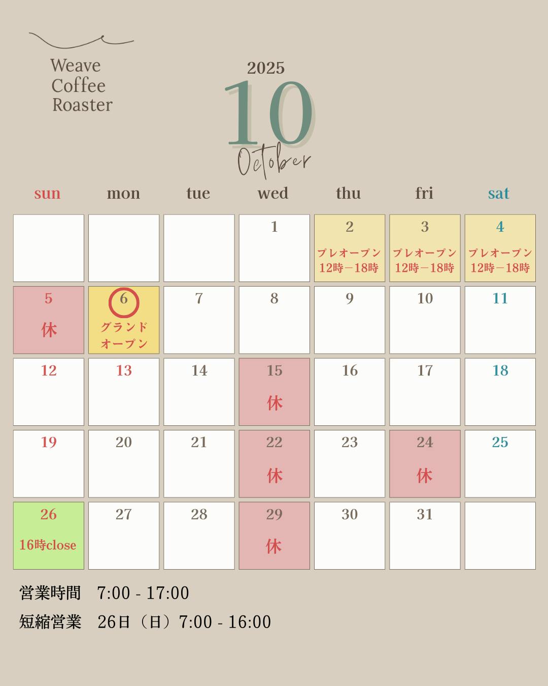 ※10月26日(日)は 7:00〜16:00 の短縮営業となります