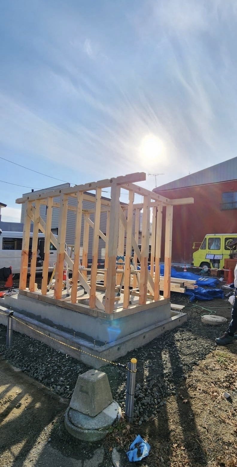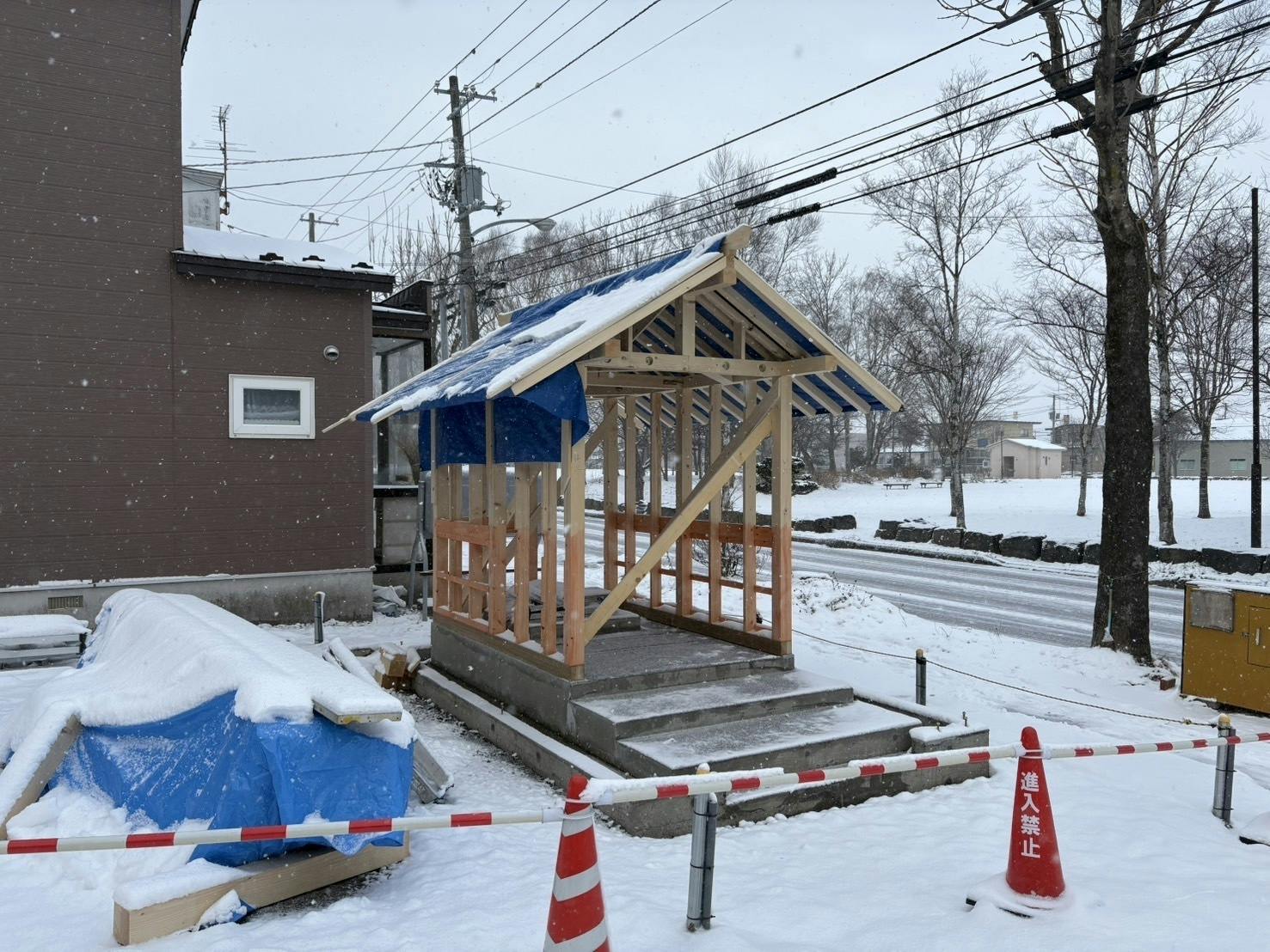 白い雪の中に立つ新しいお社の柱を見つめながら、