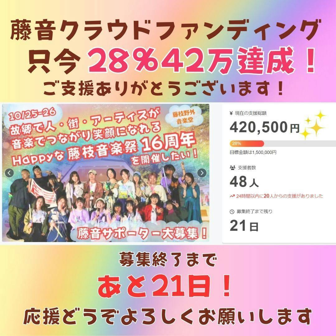 【 藤枝音楽祭クラウドファンディング★初日終えてご報告&感謝 】昨晩スタートした10/25-26藤枝音楽祭クラウドファンディング初日を終えて!目標150万のうち 【 28% 42万円 】ものご支援をいただきました!!ご支援くださったみなさま、本当にありがとうございます初動からこれほど大きな力をいただけて、心から感謝の気持ちでいっぱいです!!!クラファンは最初の勢いが達成成功のカギと言われております🗝ぜひお気に入り登録やシェア、そして応援で一緒に藤音の虹を広げていただけたら嬉しいですどうぞ引き続きよろしくお願いいたします★藤枝音楽祭クラウドファンディングはこちら https://camp-fire.jp/projects/872323/------------------------------そして、この後★9/27㈯22:30~千紘×浅羽由紀藤枝音楽祭クラウドファンディング初日ありがとう配信!!!をYoutubeでやりますぜひ、いらしてくださいhttps://youtube.com/live/e0knPXCikow?feature=share