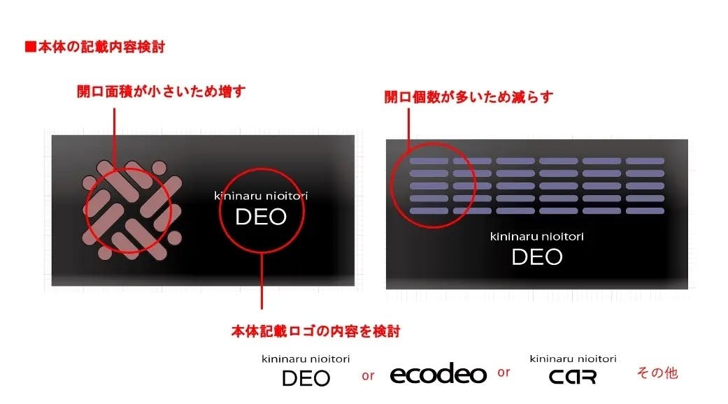 また、中央のロゴ表記についても、「どの言葉がこの商品の世界観にふさわしいのか?」という観点から“DEO”“ecodeo”“CAR”など、複数案を比較・検討しました。